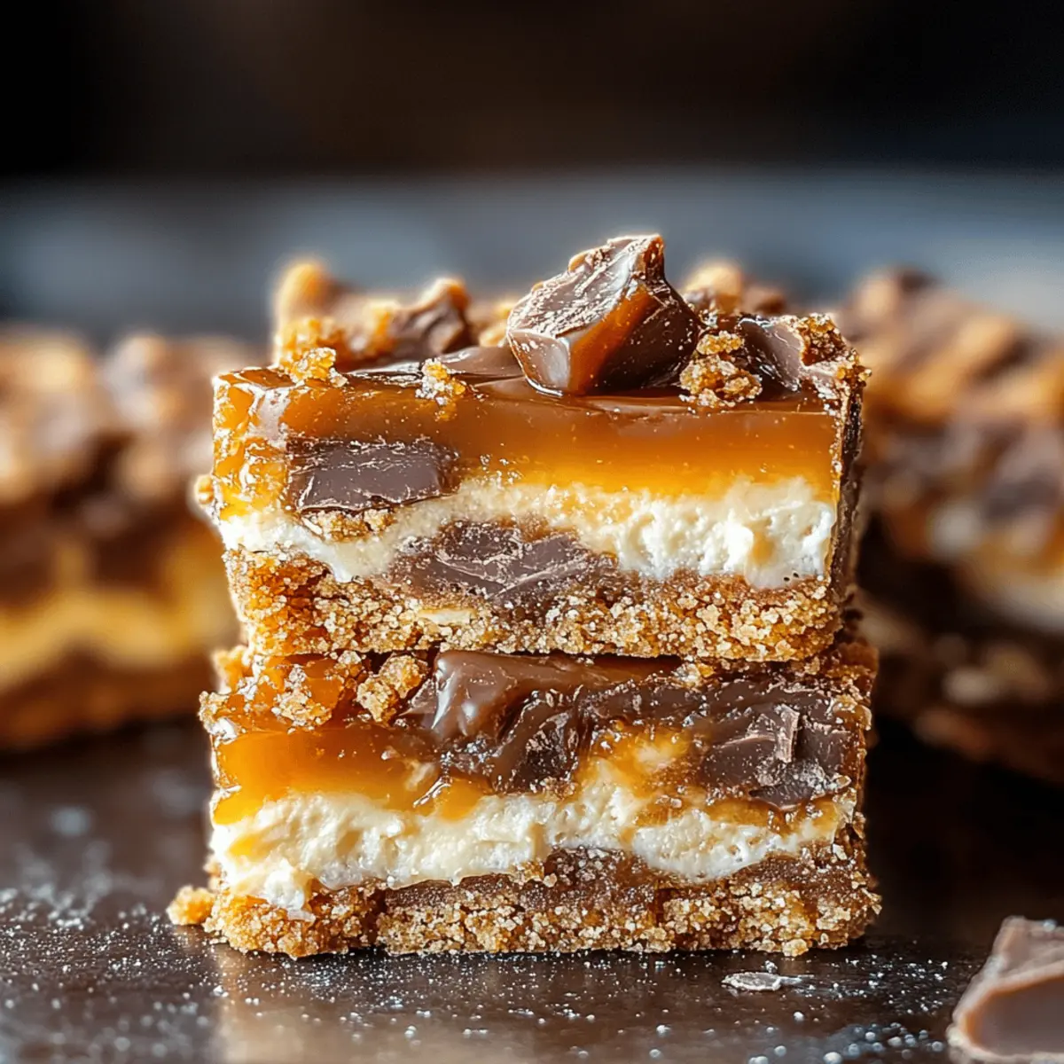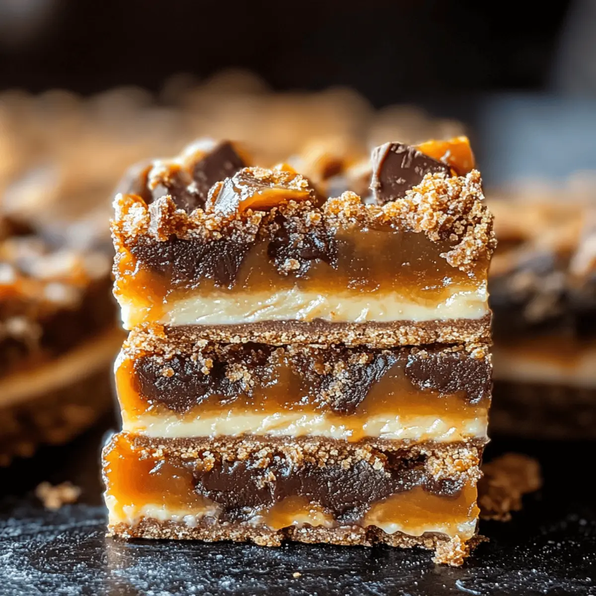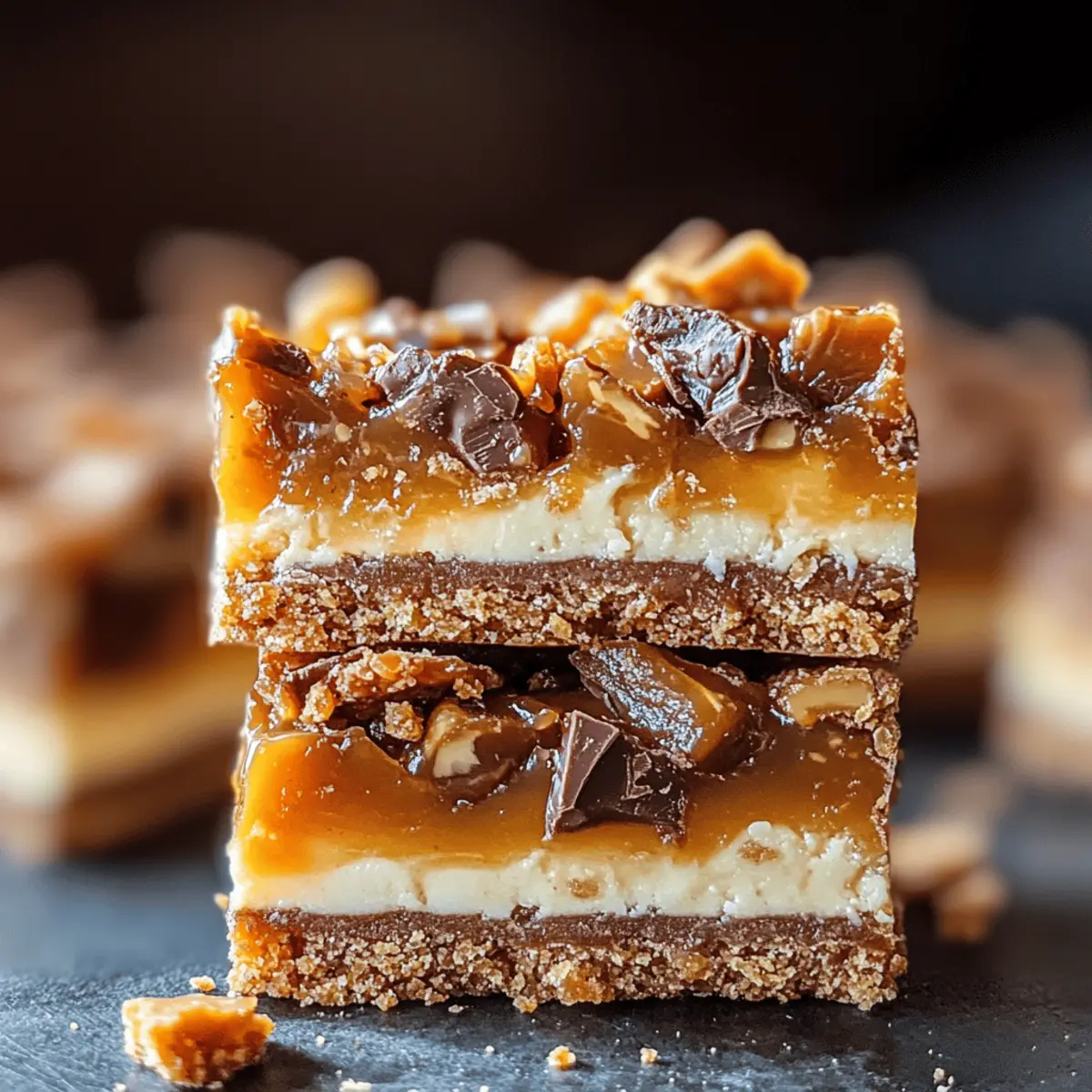 Chilled treats are the ultimate summer saviors, especially when they combine the beloved flavors of candy. Enter these No-Bake Butterfinger Caramel Bars—a dessert that delivers a delightful crunch and gooey sweetness in every bite. With just a few simple steps and zero baking required, you can whip up this easy dessert that’s perfect for summer picnics or casual get-togethers, ensuring you spend more time enjoying and less time in the kitchen. The luscious blend of buttery caramel intertwined with crunchy Butterfinger pieces makes these bars a crowd-pleaser that everyone will adore. Are you ready to indulge in a treat that’s both fun to make and a guaranteed favorite? Let’s dive into this delicious recipe! Why Are These Bars a Must-Make? Irresistible indeed! These No-Bake Butterfinger Caramel Bars combine delightful textures and flavors that make them a standout treat. Quick and Easy: With just a few steps, you can create a dessert that’s perfect for any occasion. Crowd-Pleasing Appeal: Their delectable mix of gooey caramel and crunchy Butterfinger pieces will have everyone asking for seconds! Plus, they require no baking—just chill and serve. Versatile Variations: Feel free to switch up the flavors using different candy bars or add nuts for a twist. Indulge in summer bliss with these bars and explore even more tasty creations like Gooey Chocolate Chip Cookie Bars! Butterfinger Caramel Bars Ingredients • Get ready to whip up these easy-to-make delights! For the Base Graham Crackers – Provide a sturdy structure; crush or break into pieces to create a solid foundation. Mini Marshmallows – These add a wonderfully gooey texture; feel free to substitute with larger marshmallows, cutting them into smaller bits. For the Filling Caramel Bits – Bring the sweetness and richness to the bars; you can use homemade caramel for a custom twist. Milk – Helps melt the caramel into a smooth consistency; swap it out for heavy cream for a richer flavor. Butterfinger Bites – Infuse that delightful crunch and unique flavor; can be substituted with other candy bars like Snickers or Reese’s for a different taste. For Topping Semi-Sweet Chocolate (for drizzling) – Adds a rich, chocolatey finish; consider using dark chocolate for a more intense flavor. Enjoy creating your own version of these Butterfinger Caramel Bars, and watch them disappear at your next gathering! Step‑by‑Step Instructions for No-Bake Butterfinger Caramel Bars Step 1: Prepare the Pan Begin by lining a 9×9 inch baking pan with aluminum foil, leaving some overhang on the sides for easy removal later. Lightly spray the foil with cooking spray to prevent sticking. This will ensure that your No-Bake Butterfinger Caramel Bars come out perfectly when it’s time to slice and serve. Step 2: Layer the Base Break the graham crackers into pieces and fill the bottom of the prepared pan snugly. Aim for a tightly packed layer to create a sturdy base that holds your bars together. This layer serves as the perfect foundation for the gooey filling, so ensure it covers the entire bottom evenly. Step 3: Add Marshmallows Evenly distribute a layer of mini marshmallows over the graham cracker base. Make sure every corner is covered with these fluffy treats, adding a tasty, gooey texture to the bars. You want to create an inviting layer that will be enveloped by the melted caramel and Butterfinger pieces. Step 4: Melt Caramel In a microwave-safe bowl, combine the caramel bits and milk, stirring them together for a smooth mixture. Microwave the mixture in 1-minute intervals, stirring frequently, until it’s fully melted and smooth—about 2-3 minutes total. Pay attention to avoid scorching; a velvety caramel will coat everything beautifully in your No-Bake Butterfinger Caramel Bars. Step 5: Spread Caramel Once the caramel is melted, drizzle it generously over the marshmallow layer, spreading it evenly with a spatula. Ensure the caramel seeps into all sides, bonding with the marshmallows and creating a sticky, sweet second layer. The caramel should look glossy and inviting, making your bars even more irresistible. Step 6: Add Butterfinger Chop your Butterfinger bites into smaller pieces and scatter them over the melted caramel layer. Press down lightly to ensure they adhere well to the gooey caramel. This step adds a delightful crunch and unique flavor that will make your No-Bake Butterfinger Caramel Bars truly special. Step 7: Drizzle Chocolate Melt the semi-sweet chocolate in microwave-safe intervals until smooth and drizzle it over the top of the layered bars. Use a spoon or a piping bag for a beautiful finish. The melted chocolate adds an extra dimension of richness to your bars and beautifully contrasts with the caramel and Butterfinger pieces. Step 8: Chill Refrigerate the assembled bars for about 1 hour, or until set. This cooling step is crucial for helping all layers meld together, ensuring that when you slice them, the bars hold their shape. Once chilled, the bars will be firm yet still have a deliciously gooey center. Step 9: Slice and Serve Using the overhang of the foil, lift the entire batch of bars out of the pan. Transfer to a cutting board and slice into squares or rectangles, as preferred. Serve these delightful No-Bake Butterfinger Caramel Bars chilled or at room temperature, and watch them disappear quickly! Make Ahead Options These No-Bake Butterfinger Caramel Bars are a fantastic option for meal prep enthusiasts looking to save time! You can prepare the graham cracker base and the marshmallow layer up to 24 hours in advance and store them covered in the refrigerator to keep them fresh. Additionally, the melted caramel can be prepared ahead of time and refrigerated—it will still be easy to spread when you’re ready to assemble. Just remember to gently reheat it until smooth. When you’re ready to serve, simply layer the caramel and Butterfinger pieces, drizzle with chocolate, and chill until set. This way, you