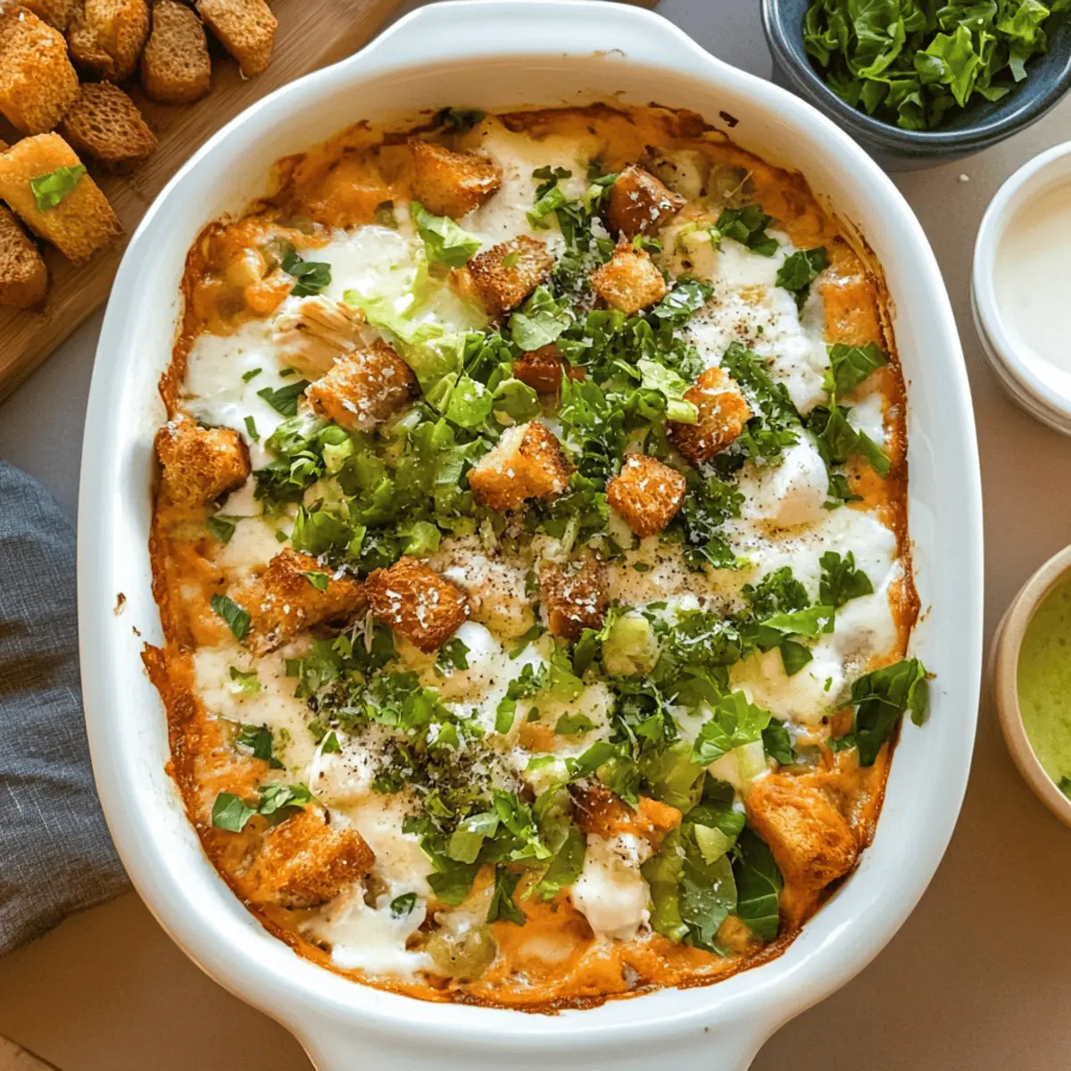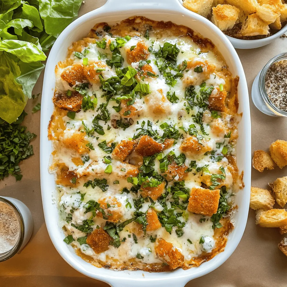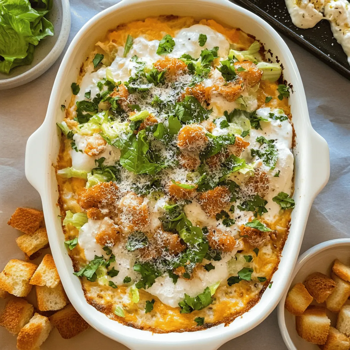 As I gathered with friends for a game night, we craved something hearty yet comforting. That’s when the idea of turning a classic Caesar salad into a warm, creamy Caesar Salad Dip struck me! This delectable creation brings together tender rotisserie chicken and a silky homemade dressing, all nestled under a bubbling layer of cheese. Not only is this dip perfect for parties, but it’s also a quick, crowd-pleasing appetizer that will vanish in seconds. With every bite, you’ll enjoy a blend of rich flavors and textures that evoke the essence of a fresh Caesar salad in a cozy dish. Are you ready to impress your guests with this irresistible dip? Why is Caesar Salad Dip a Must-Try? Creamy, Dreamy Goodness: This dip transforms the beloved flavors of Caesar salad into a cozy, creamy delight. Easy to Make: With just a few simple steps, you can whip up this dish, even on a busy weeknight! Crowd-Pleasing Flavor: The combination of rotisserie chicken, rich cheeses, and tangy dressing is sure to impress your guests. Versatile Toppings: Customize your dip with hearty add-ins like bacon or fresh veggies, and serve it with an array of dippers for variety! Perfect for Parties: Ideal as a hearty appetizer, this dip is perfect for gatherings, game nights, or simply enjoying with family. Ready to make a splash with your next meal? For a refreshing side, check out my Fruit Salad Honey or pair it with a classic Macaroni Salad Discover! Caesar Salad Dip Ingredients For the Dip • Mayonnaise – The base for creamy texture; for a lighter option, substitute with Greek yogurt. • Buttermilk – Adds a tangy flavor; whole milk can work if you prefer a creamier texture. • Whole Milk – Provides creamy consistency; consider using heavy cream for extra richness. • Lemon Juice – Infuses a zesty kick that helps balance the flavors beautifully. • Worcestershire Sauce & Anchovy Paste – Together, they bring essential umami depth to the dressing. • Minced Garlic – Enhances flavor with a subtle kick; use fresh for added depth. • Yellow Mustard – Introduces a hint of sharpness to the mix. • Dried Parsley & Black Pepper – Completes the seasoning profile and adds a pinch of freshness. • Parmesan Cheese – Thickens dressing and elevates overall flavor; freshly grated is best! • Rotisserie Chicken – This tender protein is the star ingredient; aim for about 1 pound shredded. • Shredded Mozzarella & Cheddar Cheese – Creates the gooey, golden topping; Monterey Jack is a great substitute. For the Toppings • Romaine Lettuce – For that fresh crunch on top; don’t skimp! • Croutons – Adds delightful texture; sprinkle generously for extra crunch. • Bacon (optional) – For a touch of indulgence, crispy chopped bacon makes a great finishing touch. • Extra Caesar Dressing (optional) – Drizzle on top for an enhanced flavor burst; it’s truly a game-changer! Now that you’ve got the ingredients ready, let’s dive into creating this creamy Caesar Salad Dip that’ll leave your guests wanting more! Step‑by‑Step Instructions for Caesar Salad Dip Step 1: Make Caesar Dressing In a mixing bowl, combine 1 cup of mayonnaise, ¼ cup of buttermilk, ¼ cup of whole milk, and the juice of 1 lemon. Add 2 teaspoons of Worcestershire sauce, 1 teaspoon of anchovy paste, 2 minced garlic cloves, and 1 teaspoon of yellow mustard. Stir in 1 tablespoon of dried parsley and ½ teaspoon of black pepper. Finally, fold in ½ cup of freshly grated Parmesan cheese until the mixture is smooth and creamy. Step 2: Prepare Chicken Mixture Shred about 1 pound of rotisserie chicken using two forks or your hands. In a large bowl, add the shredded chicken to the creamy Caesar dressing you just made. Mix well until all the chicken pieces are thoroughly coated with the dressing, ensuring a delightful flavor in every bite of your Caesar Salad Dip. Step 3: Assemble Dip Preheat your oven to 375°F (190°C). Transfer the chicken and dressing mixture into an oven-safe dish, spreading it evenly. Generously sprinkle 1 cup of shredded mozzarella cheese and ½ cup of shredded cheddar cheese on top of the mixture. This will create a luscious cheesy layer that melts beautifully while baking. Step 4: Broil Once the dip is assembled, place it under the preheated broiler in the oven. Broil for about 2-4 minutes, keeping a close eye on it to prevent burning. You’ll know it’s ready when the cheese is bubbly and has turned a golden brown, creating a mouthwatering aroma that will entice your guests. Step 5: Add Toppings Carefully remove the dip from the oven and allow it to cool slightly. Top the Caesar Salad Dip with 1 cup of chopped romaine lettuce for a fresh crunch, and sprinkle generously with crushed croutons for added texture. If desired, finish with extra grated Parmesan cheese and a drizzle of additional Caesar dressing for extra flavor and visual appeal. Make Ahead Options These Creamy Caesar Salad Dip preparations are perfect for busy weeknights and help save you precious time! You can prepare the Caesar dressing and shred the rotisserie chicken up to 24 hours in advance—just store them separately in airtight containers in the refrigerator to maintain freshness and flavor. Additionally, assemble the dip (without baking) and refrigerate it for up to 3 days before serving. When ready to enjoy, simply top with cheese and broil for just a few minutes until bubbling and golden brown. This way, you’ll have a delicious, crowd-pleasing appetizer with minimal effort that tastes just as delightful as if you made it fresh! Expert Tips for Caesar Salad Dip Perfect Consistency: Ensure your dressing is smooth by mixing all ingredients thoroughly; lumpy dressing can affect the overall texture of the Caesar Salad Dip. Cheese Choice: Use freshly grated Parmesan and good-quality mozzarella for the best melting effect and flavor; pre-packaged cheeses often don’t melt as well. Watch the Broiler: Broiling can be tricky! Stay vigila