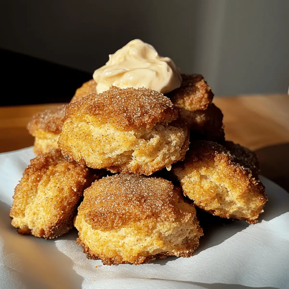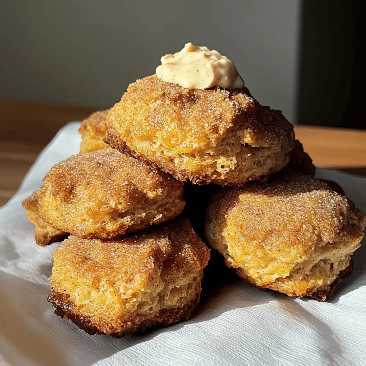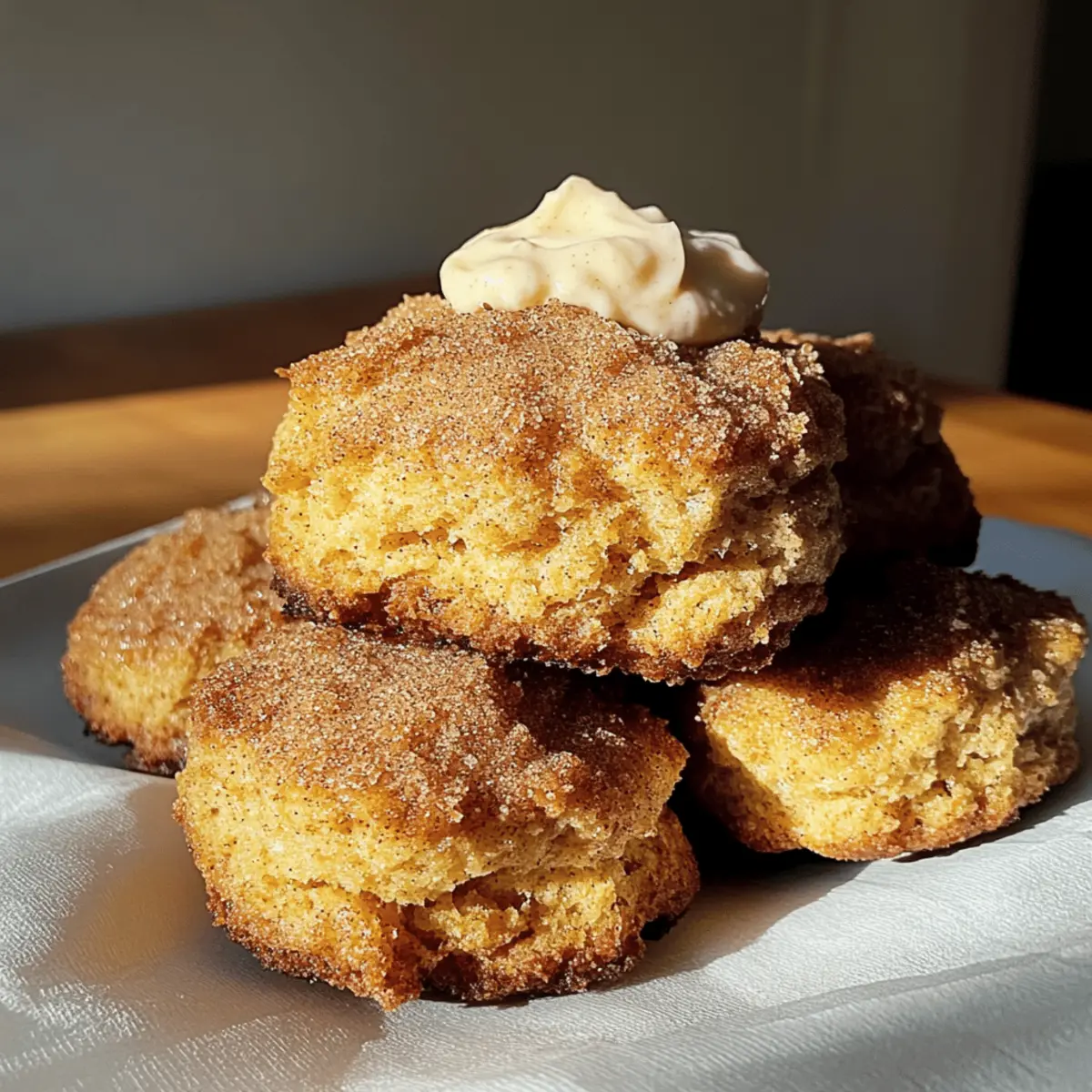 As I rolled out the dough on a crisp fall morning, the sweet aroma of cinnamon and pumpkin filled my kitchen, instantly warming my spirit. There’s something truly magical about baking, especially when it involves these delightful Cinnamon Crunch Pumpkin Cathead Biscuits with Whipped Maple Butter. What makes them irresistible is their fluffy texture inside and the satisfying crunch on top, perfect for cozy breakfasts or brunch gatherings. Plus, they come together quickly with minimal fuss, making them an exceptional choice for those busy mornings. Who wouldn’t want to treat themselves to a comforting, homemade delight like this? Curious to uncover the secrets behind this fall favorite? Let’s dive into the recipe together! Why are these biscuits a must-try? Warm, Comforting Flavors: The delightful combination of pumpkin and cinnamon creates a cozy taste that’s perfect for chilly mornings. Easy to Make: With simple ingredients and straightforward steps, anyone can whip these up in no time. Perfect for Sharing: These biscuits are a crowd-pleaser at any brunch or breakfast gathering, offering a delicious treat your friends and family will love. Versatile Options: Feel free to switch up spices or use sweet potato puree for a unique twist – there’s a version for everyone! Pair them with a warm drink or even enjoy with a drizzle of maple syrup for an extra touch of sweetness. If you’re in the mood for more pumpkin goodness, check out my Cinnamon Roll Savor for a cozy dessert option! Cinnamon Crunch Pumpkin Cathead Biscuits Ingredients For the Biscuits Cake Flour – Provides structure for a tender biscuit; homemade cake flour can be made by mixing all-purpose flour with cornstarch. All-purpose Flour – Adds body and enhances the biscuit’s texture. Granulated Sugar – Balances the spices with a touch of sweetness. Baking Powder – A leavening agent that helps the biscuits rise beautifully. Baking Soda – Contributes to tenderness, making the biscuits light and airy. Pumpkin Pie Spice or Cinnamon – Infuses warm flavors; feel free to use just cinnamon if preferred. Salt – Enhances and rounds out all the flavors in the biscuits. Salted Butter – Adds creaminess and richness; unsalted butter works if that’s what you have. Pumpkin Puree – The star ingredient, providing moisture and that lovely pumpkin flavor. Buttermilk – Ensures tenderness and a slight tang; you can substitute with homemade buttermilk using milk and vinegar or lemon juice. Greek Yogurt or Sour Cream – Boosts moisture and can act as a buttermilk substitute in a pinch. Vanilla Bean Paste or Extract – Enriches the flavor profile; pure vanilla extract is a perfect alternative. Brown Sugar – Brings extra moisture and a deeper sweetness to the biscuits. For the Whipped Maple Butter Butter – Soften beforehand for easier mixing and airy texture. Maple Syrup – Adds delightful sweetness and brings a seasonal flavor to your butter. With these ingredients for your Cinnamon Crunch Pumpkin Cathead Biscuits, you’re on your way to creating a cozy breakfast that will be a hit with loved ones! Step‑by‑Step Instructions for Cinnamon Crunch Pumpkin Cathead Biscuits Step 1: Preheat the Oven Begin your adventure by preheating your oven to 400°F (200°C). This is crucial for achieving that perfectly golden-brown exterior on your Cinnamon Crunch Pumpkin Cathead Biscuits. While the oven warms up, gather your baking sheets and line them with parchment paper, ensuring your biscuits will bake evenly and won’t stick. Step 2: Combine the Dry Ingredients In a large bowl, whisk together the cake flour, all-purpose flour, granulated sugar, baking powder, baking soda, pumpkin pie spice, and salt. This mixture forms the foundation for your biscuits, and it’s essential to whisk thoroughly until no clumps remain. Visualize a beautiful blend of colors—this is where the magic begins! Step 3: Cut in the Butter Next, add the cold salted butter to the dry ingredients. Using a pastry cutter or your fingertips, blend the butter into the flour mixture until it resembles coarse crumbs or sand. This step is vital; the bits of butter create rich, flaky layers in your Cinnamon Crunch Pumpkin Cathead Biscuits once baked. Take your time for a great texture! Step 4: Add the Wet Ingredients In a separate bowl, mix together the pumpkin puree, buttermilk, Greek yogurt, and vanilla until well-combined. Pour this mixture into your dry ingredients and gently stir until just combined. Be careful not to overmix; the dough should remain slightly lumpy for those fluffy biscuits we all crave. Step 5: Scoop onto the Baking Sheet Use a large spoon or cookie scoop to drop generous spoonfuls of the dough onto your prepared baking sheet. Aim for about 2 inches apart to give them room to spread while baking. As you form these lovely mounds, you’ll see how generous and inviting they will look once baked, ensuring delightful Cinnamon Crunch Pumpkin Cathead Biscuits. Step 6: Top with Cinnamon Crunch Take a moment to prepare your cinnamon crunch topping by mixing additional brown sugar and cinnamon together. Generously sprinkle this mixture over each biscuit before baking. This not only enhances the flavor but also adds a delightful texture and sweetness that makes every bite irresistible. Step 7: Bake Until Golden Place your baking sheet in the preheated oven and bake for 18–22 minutes, or until the tops are golden brown, and the biscuits have puffed up beautifully. Keep an eye on them during those final minutes; they should look fluffy and inviting, filling your kitchen with a cozy aroma. Step 8: Make Whipped Maple Butter While your biscuits bake, prepare the whipped maple butter. In a medium bowl, soften your butter and whip it using a hand mixer until airy and creamy. Gradually incorporate the maple syrup, ensuring it’s blended well, creating a sweet topping that complements your Cinnamon Crunch Pumpkin Cathead Biscuits perfectly. Step 9: Ser
