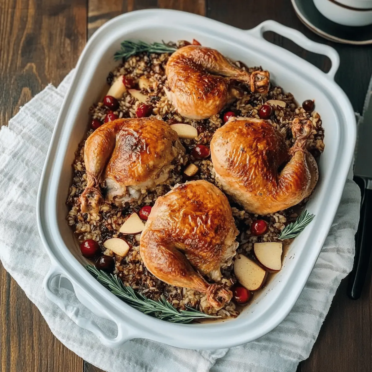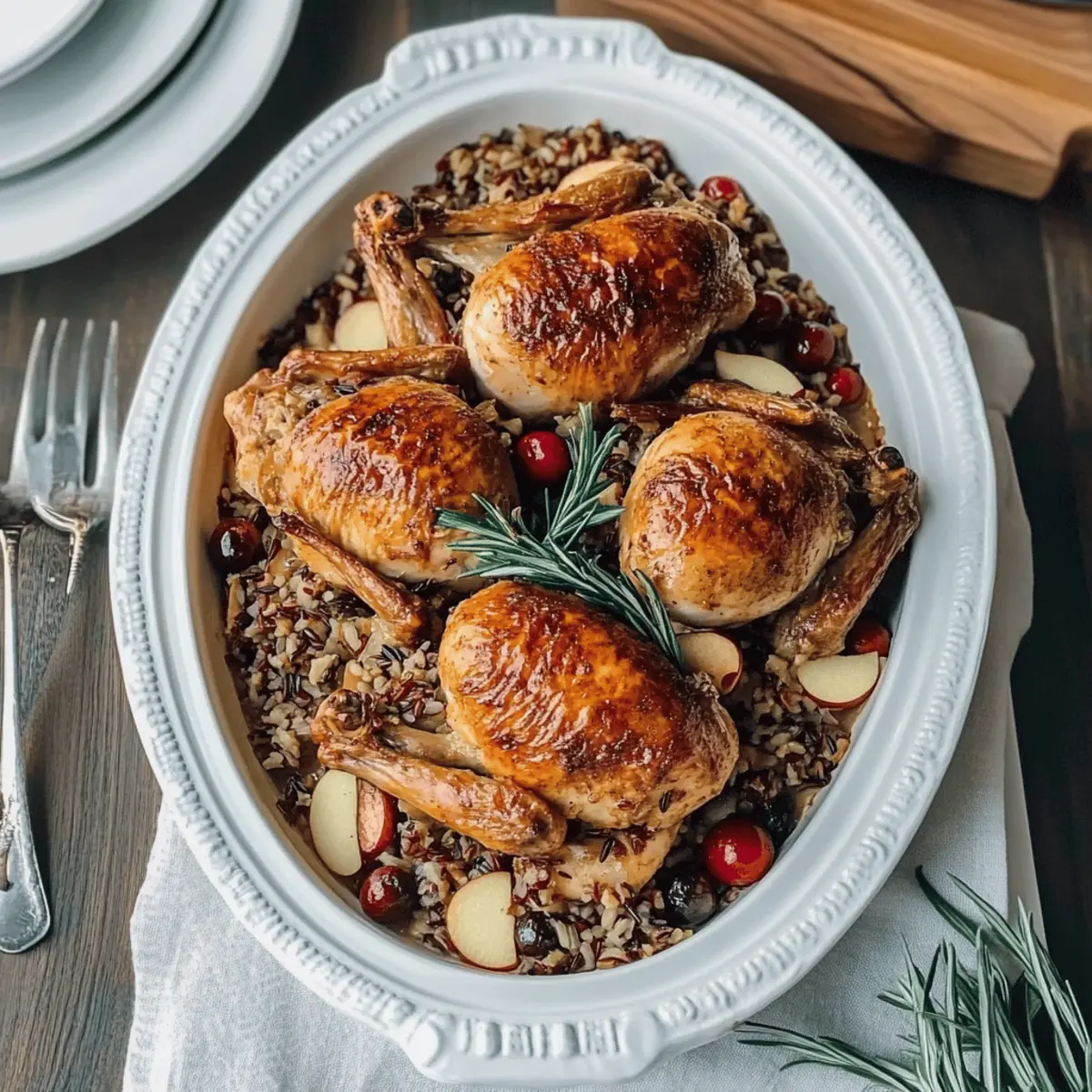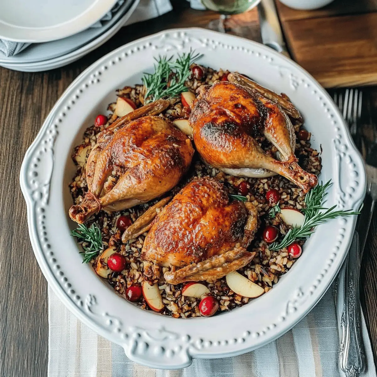 With the winter chill creeping in, the kitchen awakens to the promise of warm, inviting aromas and festive flavors. This season, I’m thrilled to share my recipe for Cornish Hens with Apple-Cranberry Rice Stuffing, a dish that transforms any gathering into an elegant celebration. These tender, golden-hued hens are not only a stunning centerpiece for your holiday table but also offer a delightful balance of sweetness and savory notes, making them perfect for those special occasions or cozy family dinners. With just a bit of prep, you can enjoy the satisfaction of creating a gourmet meal that even the busiest of home-chefs can manage. Are you ready to elevate your cooking game and impress your loved ones with this delicious dish? Why are Cornish Hens a Holiday Favorite? Elegant Presentation: These Cornish Hens not only taste amazing but also create a stunning visual impact on your holiday table. Flavor Explosion: The apple-cranberry stuffing adds a delightful mix of sweet and savory that will leave everyone asking for seconds. Easy to Prepare: With straightforward steps, you can master this recipe, making it perfect even for novice cooks. Versatile Pairings: Serve them alongside roasted vegetables or a fresh salad for a complete meal, just like with my popular Crisp Apple Salad to complement the dish. Make-Ahead Friendly: Prep the hens the night before for a seamless cooking experience on the big day, ensuring you can enjoy time spent with family and friends. These Cornish Hens with Apple-Cranberry Rice Stuffing will surely become a favorite recipe for any festive occasion! Cornish Hens with Apple-Cranberry Rice Stuffing Ingredients For the Hens • Cornish Hens – Choose hens between 1.25 to 1.5 pounds for an evenly cooked, tender result. For the Stuffing • Cooked Rice (long grain and wild or Royal Blend) – This forms the base of the stuffing, giving it a hearty texture; quinoa can be substituted for a gluten-free option. • Chopped Onion – Adds an aromatic foundation; shallots can be used for a milder flavor. • Chopped Celery – Provides crunch and flavor; omit if you prefer a simpler stuffing. • Chopped Pecans – Offers a delightful nuttiness; walnuts work well too or just leave them out for nut-free. • Diced Fuji Apples – They bring in sweetness and moisture; substitute with Honeycrisp apples for a similar effect. • Sweetened Dried Cranberries – Add a tart yet sweet taste; dried cherries or raisins can stand in if needed. • Fresh Sage & Thyme – Essential herbs that infuse flavor; use dried herbs at a one-third ratio. • Flat-Leaf Parsley – For garnish and a fresh touch in the stuffing; you can omit it if unavailable. • Kosher Salt & Black Pepper – Necessary for seasoning; table salt can also work if you’re in a pinch. For the Glaze • Apple Cider – Provides the perfect blend of sweetness and acidity; substitute with apple juice if cider isn’t available. • Maple Syrup – Enhances sweetness in the glaze; honey can replace it if needed. • Dijon Mustard – Adds depth to the glaze; can be omitted for those with allergies. • Ground Cinnamon – Complements sweet notes in the glaze; reduce or omit if you’re not a fan. With these Cornish Hens with Apple-Cranberry Rice Stuffing ingredients, you’re well on your way to creating a festive masterpiece that’s both delicious and visually stunning! Step‑by‑Step Instructions for Cornish Hens with Apple-Cranberry Rice Stuffing Step 1: Prepare the Stuffing In a skillet over medium heat, melt 4 tablespoons of unsalted butter. Sauté 1 chopped onion and 1 chopped celery stalk until softened, about 5 minutes. Stir in chopped pecans, fresh sage, thyme, kosher salt, and black pepper, cooking for another 2 minutes. Remove from heat and mix in 3 cups of cooked rice, 1 diced Fuji apple, 1 cup of sweetened dried cranberries, and ¼ cup of flat-leaf parsley, then set aside to cool. Step 2: Make the Glaze In a saucepan, combine 1 cup of apple cider and ¼ cup of maple syrup. Bring the mixture to a gentle simmer over medium heat, stirring occasionally, until it reduces to a syrupy consistency, about 10-15 minutes. Once thickened, whisk in 1 tablespoon of Dijon mustard and ½ teaspoon of ground cinnamon, ensuring all ingredients are well-combined. Set the glaze aside for later use. Step 3: Prep the Hens Remove the giblets from two Cornish hens and rinse them under cold water. Pat the hens dry with paper towels to ensure crispy skin. Preheat your oven to 425°F, and prepare a roasting pan by placing a roasting rack inside, allowing air to circulate around the hens for even cooking. Lightly season the inside cavities with kosher salt and black pepper for added flavor. Step 4: Stuff the Hens Generously fill the cavities of each hen with the prepared Apple-Cranberry rice stuffing, making sure to pack it loosely. Using kitchen twine, tie the legs together to secure the stuffing inside, which helps the hens cook evenly. After stuffing, place the hens on the roasting rack in the pan, with the breast side facing up. Step 5: Roast the Hens Brush the outside of the hens with melted butter, then sprinkle kosher salt and black pepper on the skin. Roast in the preheated oven for 20 minutes until the skin starts to brown. After 20 minutes, reduce the temperature to 375°F and continue roasting for an additional 40-50 minutes, glazing the hens every 10 minutes with the apple cider glaze during the last 30 minutes of cooking. Step 6: Check Doneness To ensure the Cornish hens are fully cooked, use a meat thermometer to check that the internal temperature has reached 180°F. Once done, remove the hens from the oven and let them rest for 10 minutes before carving or serving. This resting period helps the juices redistribute, resulting in juicy, flavorful meat when served. How to Store and Freeze Cornish Hens with Apple-Cranberry Rice Stuffing Room Temperature: Store leftover Cornish hens at room temperature for no more than 2 h