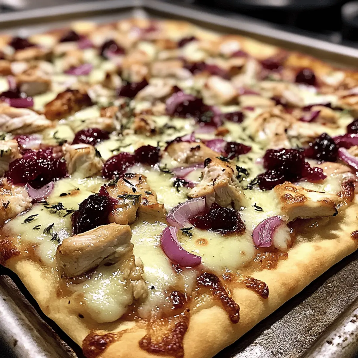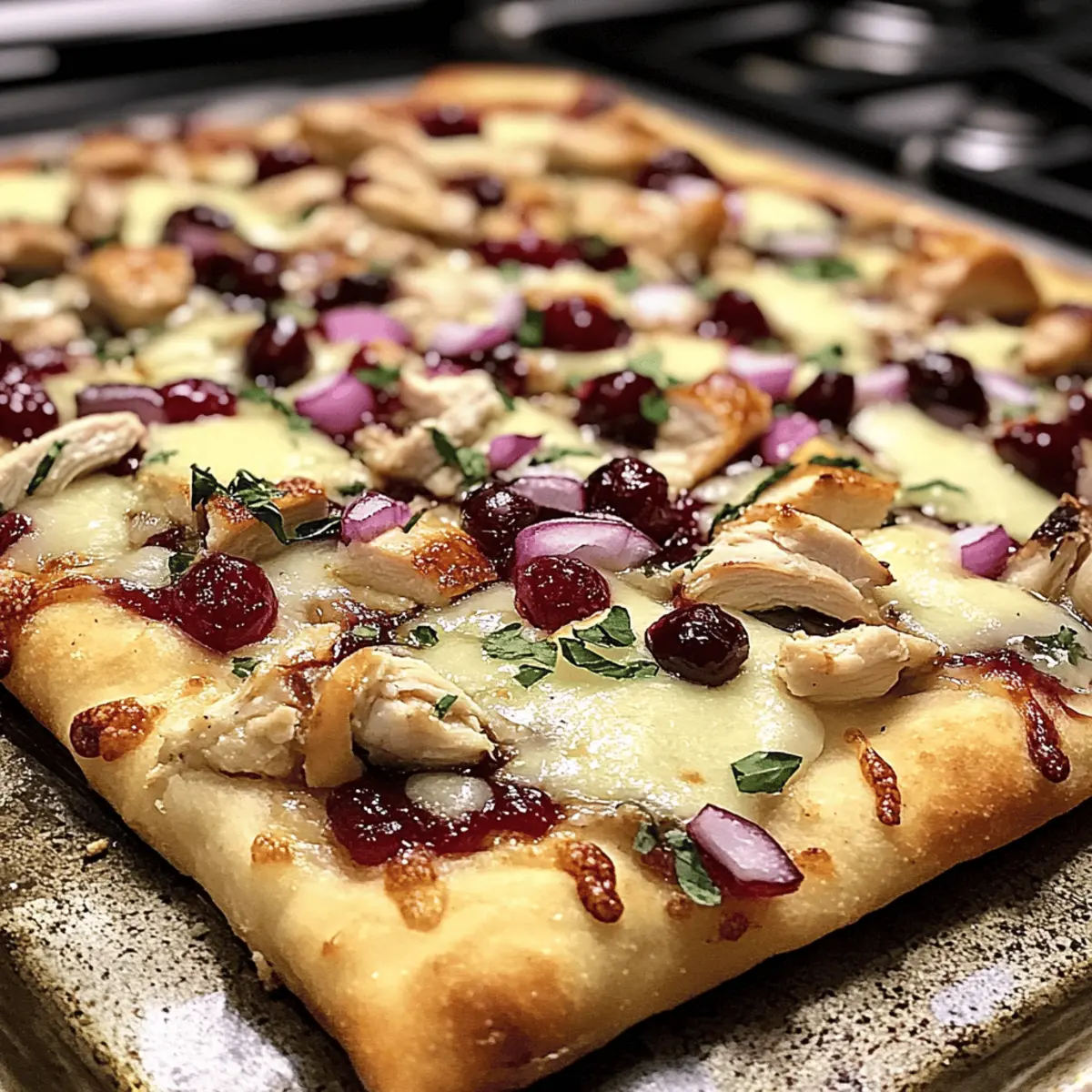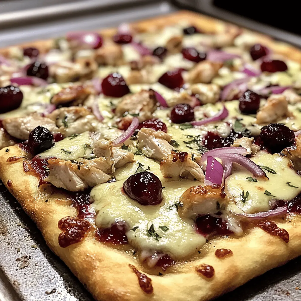 As I stood in the kitchen, a tantalizing aroma began to fill the air—an unexpected symphony of savory chicken, creamy Brie, and sweet cranberry sauce that whisked me straight to the heart of holiday feasting. This Cranberry Chicken & Brie Pizza not only tantalizes the taste buds, but it also transforms those leftover turkey and cranberry into a quick, delicious meal. In just 25 minutes, you can whip up this easy dish that’s perfect for busy weeknights or intimate gatherings. It’s a fun twist on traditional pizza, melding rich flavors that effortlessly marry comfort food with seasonal ingredients. I’m excited to share how you can take your culinary creations to the next level while cleaning out your fridge! Ready to impress your loved ones with a slice of holiday magic? Let’s dive into this irresistible recipe! Why is Cranberry Chicken & Brie Pizza a must-try? Quick, Festive Delight: In just 25 minutes, you can create a delicious pizza that captures the essence of holiday flavors, making weeknight meals feel special. Unique Flavor Combination: The luscious blend of creamy Brie and sweet cranberry sauce pairs harmoniously with tender chicken, offering a delightful twist on traditional pizza. Easy to Make: Perfect for anyone, even if you’re short on time or cooking experience; just follow the simple steps and you’ll impress everyone at the table! Make the Most of Leftovers: Transform that leftover turkey and cranberry sauce from your holiday feast into a gourmet meal, ensuring nothing goes to waste. Crowd-Pleasing Appeal: This dish is bound to be a hit among family and friends, making it an ideal option for gatherings. For a fresh side, consider serving it with a light salad or a savory Grilled Chicken Cobb to balance the richness. Indulge in this festive creation that’s as delightful as it is easy to prepare! Cranberry Chicken & Brie Pizza Ingredients • Gather these essentials for a mouthwatering experience! For the Pizza Base Pizza Crust – Use a pre-made crust for quick assembly and hassle-free cooking. For the Toppings Shredded Chicken – Utilize leftover chicken or rotisserie for ultimate convenience and flavor. Cranberry Sauce – Adds tanginess; homemade or whole-berry varieties enhance texture. Brie Cheese – Offers creamy richness; Camembert is a suitable substitute if needed. Mozzarella Cheese – For a gooey melty experience; can swap with plant-based mozzarella for a dairy-free option. Red Onion – Provides crunch and subtle spice; feel free to omit for a milder flavor. For the Seasoning Olive Oil – Helps crisp the crust and enriches overall flavor. Thyme (Fresh or Dried) – Adds herbal notes; can be omitted for a simpler taste. Salt & Pepper – Essential for enhancing all the delicious flavors in your Cranberry Chicken & Brie Pizza. Now you’re equipped with the ingredients to make this festive pizza a reality! Let’s get cooking! Step‑by‑Step Instructions for Cranberry Chicken & Brie Pizza Step 1: Preheat the Oven Begin by preheating your oven to 425°F (220°C) to ensure it’s hot enough for baking your Cranberry Chicken & Brie Pizza. If using a pizza stone, place it in the oven while it preheats for optimal crispiness. This step is crucial for achieving that golden, crunchy crust that pairs perfectly with the luscious toppings. Step 2: Prepare the Pizza Crust Take your pre-made pizza crust and roll it out onto a baking sheet or pizza stone. Lightly brush the surface with olive oil to enhance the flavor and help achieve a delightful crisp as it bakes. Aim for an even thickness across the crust, visualizing that perfect pizza shape ready for delicious toppings. Step 3: Mix the Chicken and Sauce In a mixing bowl, combine the shredded chicken with cranberry sauce, stirring until every piece of chicken is generously coated. This blend will bring the sweet and tangy flavors front and center in your Cranberry Chicken & Brie Pizza. Once mixed, visually check that chicken pieces are evenly covered for a harmonious flavor throughout. Step 4: Assemble the Toppings Spread the cranberry chicken mixture evenly over the prepared pizza crust. Next, layer thin slices of Brie cheese atop the chicken for a creamy richness that will melt beautifully. Follow this with a generous sprinkling of shredded mozzarella cheese to create that gooey, melt-in-your-mouth experience we all love in a pizza. Step 5: Add the Vegetables and Seasoning Add thinly sliced red onion on top, bringing a satisfying crunch and subtle spiciness to your pizza. Drizzle a little additional olive oil over the top, then sprinkle with fresh or dried thyme, salt, and pepper to infuse aromatic flavors. This layering will enhance the overall taste of your Cranberry Chicken & Brie Pizza as it bakes. Step 6: Bake the Pizza Carefully transfer your assembled pizza into the preheated oven. Bake for 12-15 minutes, keeping a close eye on it. You’ll know it’s ready when the cheese is melted and bubbling, and the crust takes on a lovely golden-brown hue. This is the moment your kitchen will smell phenomenal, signaling deliciousness is just around the corner. Step 7: Cool and Serve Once baked to perfection, carefully remove the Cranberry Chicken & Brie Pizza from the oven and let it cool for a couple of minutes. This cooling step allows the cheese to set slightly, making it easier to slice. After a brief wait, cut your pizza into wedges, and feel free to top it with fresh arugula or spinach for a burst of color and freshness before serving. How to Store and Freeze Cranberry Chicken & Brie Pizza Fridge: Store any leftovers in an airtight container in the refrigerator for up to 3 days. This keeps the flavors intact while ensuring freshness. Freezer: If you want to freeze your pre-assembled pizza, wrap it tightly in plastic wrap and then foil. It can be stored in the freezer for up to 2 months, perfect for a quick meal later. Reheating: When ready to enjoy, reheat in the oven at 350°F (175°C) for about 10