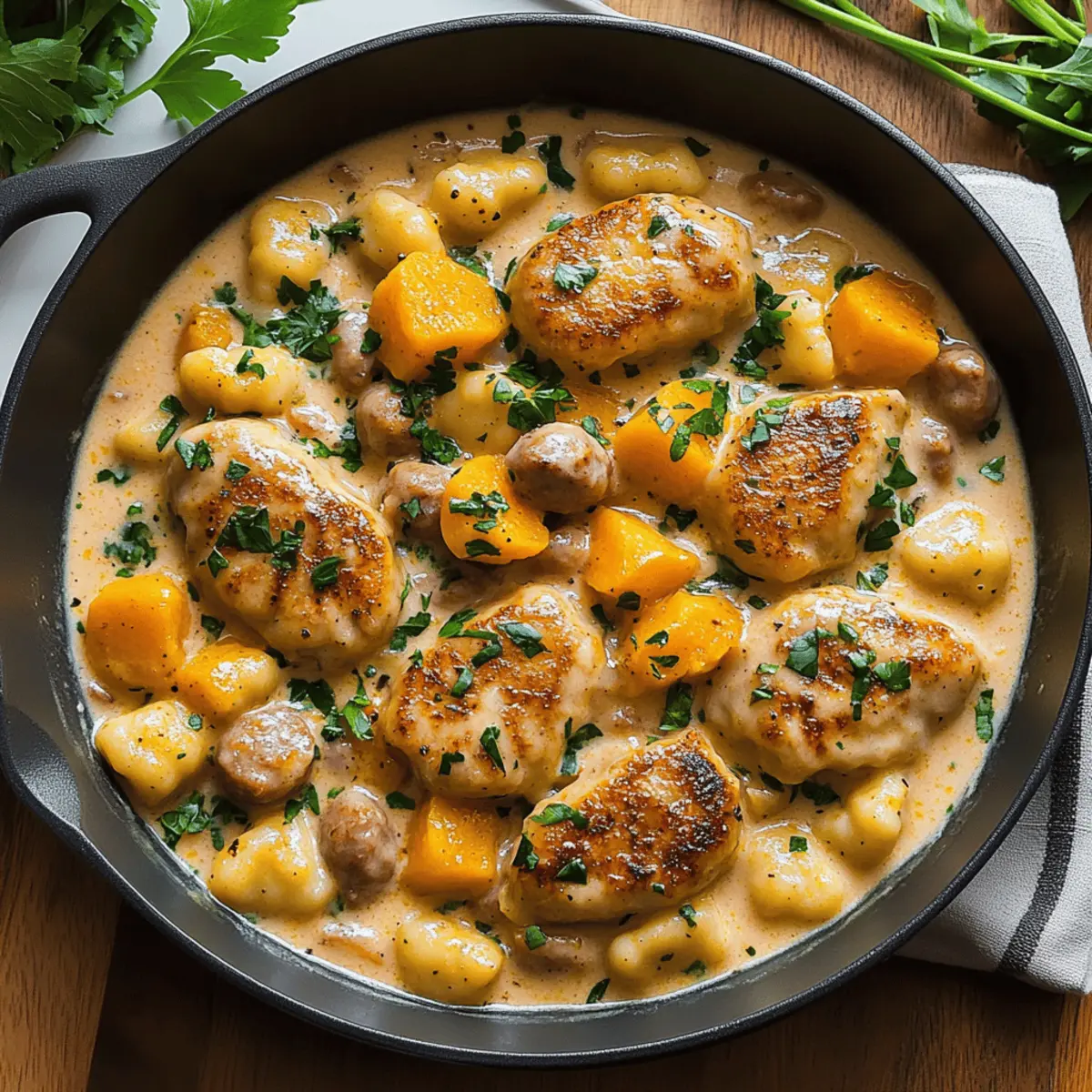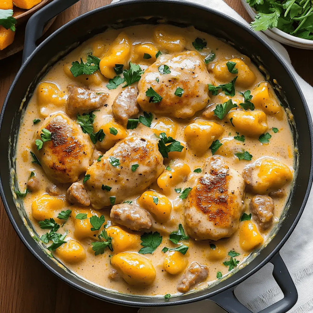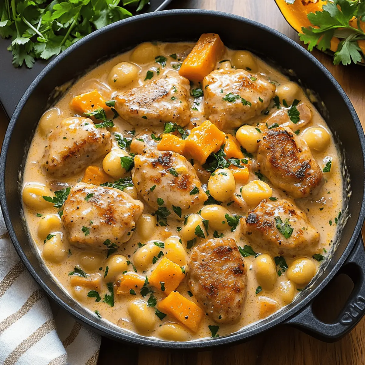 As I stepped into the kitchen, the aroma of roasting butternut squash immediately enveloped me, igniting a joyful culinary journey. I couldn’t resist the allure of making Creamy Butternut Squash Gnocchi with Sausage, a dish that beautifully marries earthy sweetness and savory depth. This recipe stands out not only for its creamy comfort but also for the quick prep time, making it perfect for weeknight dinners or cozy gatherings. Plus, it’s easily adaptable for vegetarians, ensuring everyone can savor its warmth. Join me as we explore this delightful recipe that promises to bring smiles and warmth to your table, making even the simplest meals feel special. What will you pair with it for the ultimate comfort food experience? Why is this recipe a must-try? Comfort Food Bliss: The Creamy Butternut Squash Gnocchi with Sausage is the epitome of comfort food, offering a rich and velvety texture that hugs every piece of gnocchi. Quick Prep Time: With a straightforward preparation process, you can whip this dish up in under 30 minutes, perfect for busy weeknights. Versatile Options: Don’t hesitate to make it vegetarian by swapping in a plant-based sausage; everyone deserves a taste! Deliciously Aromatic: The combination of garlic, onion, and thyme creates an enticing aroma that will fill your home with warmth. Crowd-Pleasing Appeal: Whether you’re hosting a dinner party or having a cozy night in, this dish is sure to impress and satisfy all palates. Pair it with a simple green salad for a complete meal that feels indulgent yet comforting! Creamy Butternut Squash Gnocchi Ingredients For the Gnocchi • Butternut Squash – Adds natural sweetness and creamy texture; a pumpkin can be a fun substitute if you’re feeling adventurous. • Gnocchi – Provides that delightful, tender base; homemade is best for this recipe, but store-bought works in a pinch for those busy nights. For the Sauce • Italian Sausage – Contributes savory, robust flavors; for a vegetarian option, try a plant-based sausage for a delicious twist! • Heavy Cream – Creates that luxurious, creamy sauce texture; swap it out with coconut cream for a dairy-free delight. • Parmesan Cheese – Offers a salty, nutty flavor; nutritional yeast can be your go-to for a vegan alternative that still packs a punch. • Garlic – Adds aromatic depth; fresh garlic cloves are preferred, but garlic powder can be used if you’re in a hurry. • Onion – Complements the garlic beautifully; shallots can be an excellent alternative for a milder flavor. • Thyme – Brings herbal notes that elevate the dish; feel free to use dried thyme if fresh isn’t available. For Serving • Fresh Herbs – Add a sprinkle of fresh parsley or basil for a vibrant finish. • Garlic Bread or Salad – Pair with a simple green salad or fluffy garlic bread for that complete, cozy meal experience. Don’t miss out on this delightful Creamy Butternut Squash Gnocchi with Sausage recipe that brings both warmth and comfort to your dining table! Step‑by‑Step Instructions for Creamy Butternut Squash Gnocchi with Sausage Step 1: Prepare the Gnocchi If you’re making homemade gnocchi, start by mixing flour and eggs in a large bowl until a dough forms. Knead the dough on a floured surface for about 5 minutes until smooth. Roll it out to about ½ inch thick, then cut into small pieces. If using store-bought gnocchi, get a large pot of salted water boiling while you move on to the next step. Step 2: Cook the Butternut Squash Slice the butternut squash in half, scoop out the seeds, and roast the halves cut-side down at 400°F (200°C) for about 25-30 minutes until fork-tender. Alternatively, you could steam the squash pieces until soft. Once cooked, scoop the flesh into a bowl and mash until creamy, setting it aside for the sauce. Step 3: Cook the Sausage In a large skillet, heat a drizzle of olive oil over medium heat. Add the Italian sausage and cook for about 5-7 minutes, breaking it apart with a spatula until browned and cooked through. Once done, remove the sausage from the skillet and drain on a paper towel, leaving the flavorful drippings in the pan. Step 4: Make the Sauce In the same skillet used for the sausage, sauté chopped onions and minced garlic over medium heat for about 3-4 minutes until fragrant and translucent. Pour in the heavy cream and add the mashed butternut squash, stirring until everything is well combined and the sauce is smooth, about 2-3 minutes. Step 5: Combine Ingredients Carefully add the cooked gnocchi to the creamy sauce along with the browned sausage. Toss everything together gently over medium heat to ensure the gnocchi is evenly coated and heated through, about 5 minutes. Season with fresh thyme, salt, and pepper to taste, allowing the flavors to meld beautifully. Step 6: Serve and Garnish Transfer your creamy butternut squash gnocchi with sausage to a serving dish. Garnish with freshly grated Parmesan cheese and sprinkle with chopped herbs, like parsley or basil, for a vibrant finish. Enjoy this comforting dish warm, perhaps alongside garlic bread or a fresh salad for the ultimate cozy meal! Expert Tips for Perfect Gnocchi Smooth Squash: Ensure your butternut squash is thoroughly roasted until tender; this will help achieve a creamy texture for your Creamy Butternut Squash Gnocchi with Sausage. Avoid Sticky Gnocchi: If making your own gnocchi, lightly dust with flour to prevent sticking. Overworking the dough can lead to tough gnocchi. Sauce Consistency: Keep the heat at medium-low when adding cream to avoid separating; a gentle simmer is key for a luscious sauce. Flavor Boost: Don’t skimp on the thyme! Fresh thyme works best, but dried thyme can also add lovely herbal notes to your dish. Vegetarian Version: If opting for a vegetarian adaptation, choose a plant-based sausage that complements the creamy butternut squash flavors beautifully. Make Ahead Options These Creamy Butternut Squash Gnocchi with Sausage are an ex