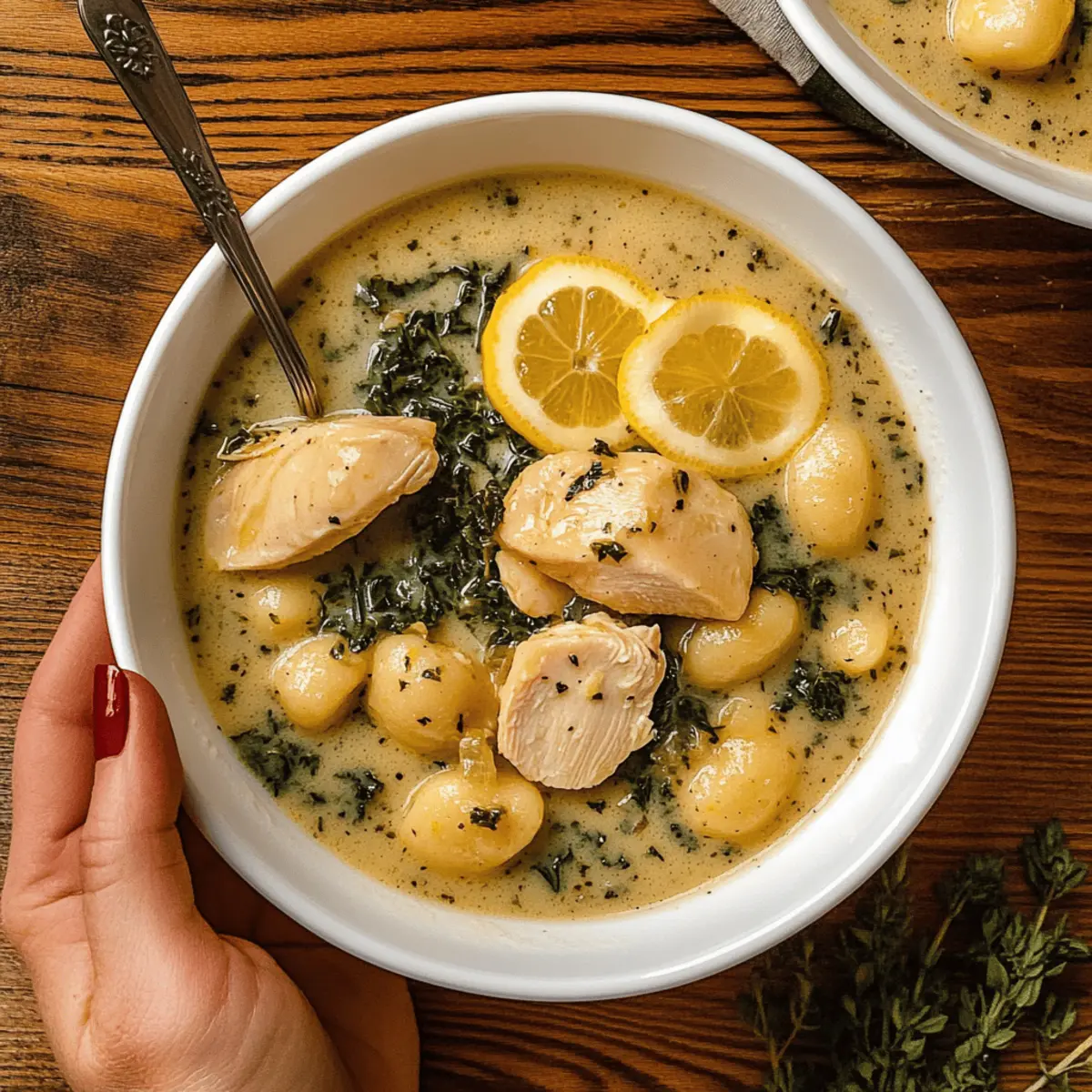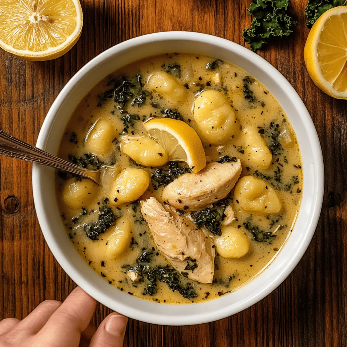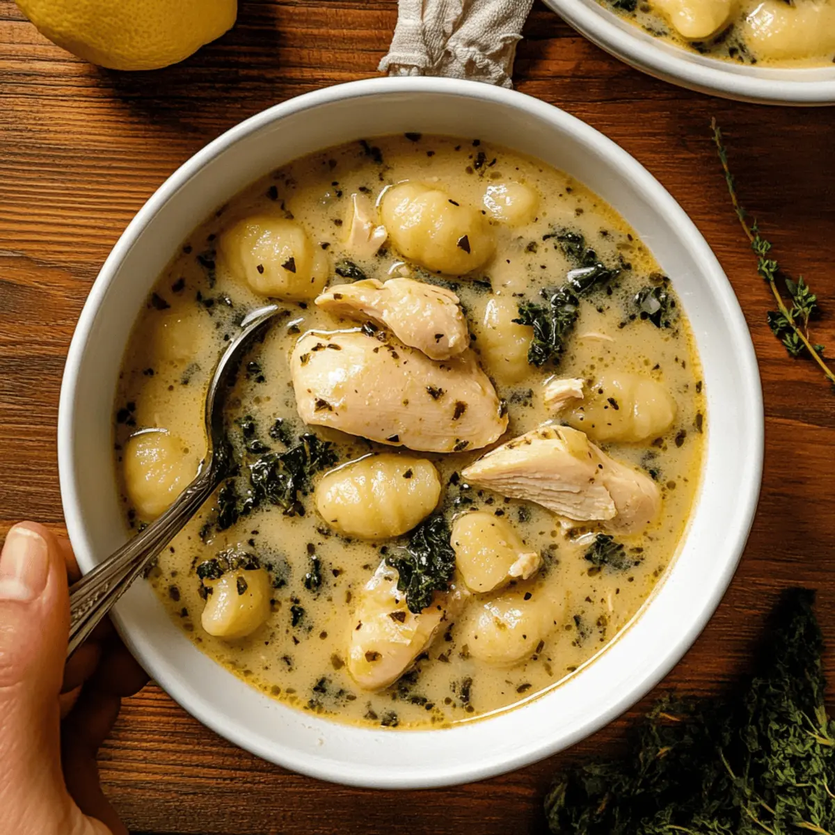 As I stirred the mix of creamy broth and bright, zesty lemon, the warm, inviting scent enveloped my kitchen—always a tantalizing reminder that comfort food can also be a little fancy. This Creamy Winter Lemon Chicken Gnocchi Soup is designed for those chilly evenings when a quick, satisfying meal is just what you need. With its gluten-free and vegan options, it embraces everyone at the table, offering hearty flavors that warm the soul. This dish not only incorporates fluffy gnocchi and tender chicken but also provides the perfect balance of richness and brightness, setting the tone for a cozy gathering. Ready to discover a delicious twist on winter soups that’s bound to become a family favorite? Let’s dive into this recipe together! Why is This Soup a Must-Try? Cozy warmth: This Creamy Winter Lemon Chicken Gnocchi Soup wraps you in warmth, making it the perfect antidote to chilly days. Versatile options: With gluten-free and vegan choices, it caters to everyone, ensuring no one misses out on the comfort. Rich texture: The velvety broth and fluffy gnocchi create an indulgent mouthfeel that you’ll crave time and again. Bright flavors: Zesty lemon cuts through the creaminess, adding a refreshing twist that elevates this classic dish. Time-saving: Easy to prepare in under 30 minutes, it’s a go-to when you need something hearty yet quick. Crowd-pleaser: Whether for a family dinner or a cozy gathering, this soup impresses and satisfies all appetites—just like a hearty Chicken Noodle Casserole. Creamy Winter Lemon Chicken Gnocchi Soup Ingredients For the Chicken Organic Chicken Breasts (2 lbs) – Provides protein and substance; substitute with tofu or chickpeas for a vegan option. For the Base Extra Virgin Olive Oil (2 Tbsps) – Adds healthy fat and flavor; can be replaced with any cooking oil. Unsalted Butter (2 Tbsps) – Adds richness; replace with vegan butter for a vegan version. Garlic Cloves (4, minced) – Provides aromatic depth; can substitute with garlic powder, 1 tsp. Organic All-Purpose Flour (4 Tbsps) – Thickens the soup; for gluten-free, use cornstarch. Organic Chicken Stock (5 cups) – Base for the soup; vegetable stock can replace for a vegan option. Freshly-Squeezed Lemon Juice (1) – Brightens the soup; lime juice is a good substitute. Organic Heavy Cream (1 ½ cups) – Provides creaminess; use coconut cream or cashew cream for a vegan option. For the Soup Potato Gnocchi (1 package/16 oz) – Main carbohydrate component; use gluten-free gnocchi for a GF option. Organic Kale (2 cups, chopped) – Adds nutrients; can substitute with spinach or other greens. Fresh Thyme Sprigs (4) – Adds herbaceous flavor; substitute with dried thyme if fresh is unavailable. On Everything All-Purpose Blend (2 tsps) – Flavor boost; make your own blend or use Italian seasoning. Sea Salt & Black Pepper – Seasoning for balance and flavor enhancement. For the Garnish Freshly-Grated Parmesan Cheese (1 cup) – Adds nutty flavor and creaminess; vegan cheese shreds as a substitute. Lemon (1, sliced thin) – Provides brightness and acidity; use lime as an alternative. Lemon Zest (1 tsp) – Enhances lemon flavor; can be omitted if not available. This Creamy Winter Lemon Chicken Gnocchi Soup makes for a cozy, comforting dish that you may find perfect for cold evenings. Enjoy! Step‑by‑Step Instructions for Creamy Winter Lemon Chicken Gnocchi Soup Step 1: Prepare the Baked Lemon Chicken Preheat your oven to 400°F (200°C) and prepare a baking sheet lined with parchment paper. Season the organic chicken breasts with extra virgin olive oil, sea salt, black pepper, lemon zest, and add thin lemon slices on top. Bake for 15-20 minutes until the chicken is golden brown and fully cooked through, then slice into medium-thin pieces after cooling slightly. Step 2: Make the Soup Base In a Dutch oven, melt 2 tablespoons of unsalted butter over medium-high heat. Once melted, sauté the minced garlic for about 1-2 minutes until fragrant, stirring occasionally to prevent burning. Next, stir in the all-purpose flour and your chosen seasoning blend, ensuring everything is combined and slightly golden for enhanced flavor, about 1 minute. Step 3: Add the Chicken Stock Gradually pour in the 5 cups of organic chicken stock while constantly stirring to avoid lumps. Continue to cook for approximately 5 minutes until the mixture thickens slightly, creating a smooth base for your Creamy Winter Lemon Chicken Gnocchi Soup. The consistency should coat the back of a spoon nicely. Step 4: Combine Cream and Lemon Carefully add in the 1 ½ cups of organic heavy cream, freshly squeezed lemon juice, lemon zest, and the chopped kale. Stir well to mix all the ingredients together. Incorporate the sliced baked chicken and the potato gnocchi into the pot, ensuring even distribution. Allow the soup to simmer on medium heat for about 10-12 minutes until the gnocchi is tender and begins to float to the top. Step 5: Finish with Parmesan After simmering, stir in the 1 cup of freshly grated Parmesan cheese until it melts completely, creating a creamy and luxurious finish to your soup. Cook for an additional 1-2 minutes, allowing the flavors to meld together beautifully. Step 6: Serve and Enjoy Remove the thyme sprigs from the soup and ladle the Creamy Winter Lemon Chicken Gnocchi Soup into warm bowls. Optionally, serve with crusty bread or a fresh salad to complement the dish. Enjoy the inviting warmth and comforting flavors of this delightful winter soup! Creamy Winter Lemon Chicken Gnocchi Soup Variations Embrace your creativity with these delightful twists to make this comforting soup your own! Vegan Version: Substitute chicken with tofu, use vegan butter and coconut cream, creating a warm, plant-based bowl. Gluten-Free Option: Replace gnocchi with gluten-free varieties and ensure all ingredients are certified gluten-free for a safe enjoyment. Extra Greens: Swap out kale for fresh spinach or collard greens, adding vi