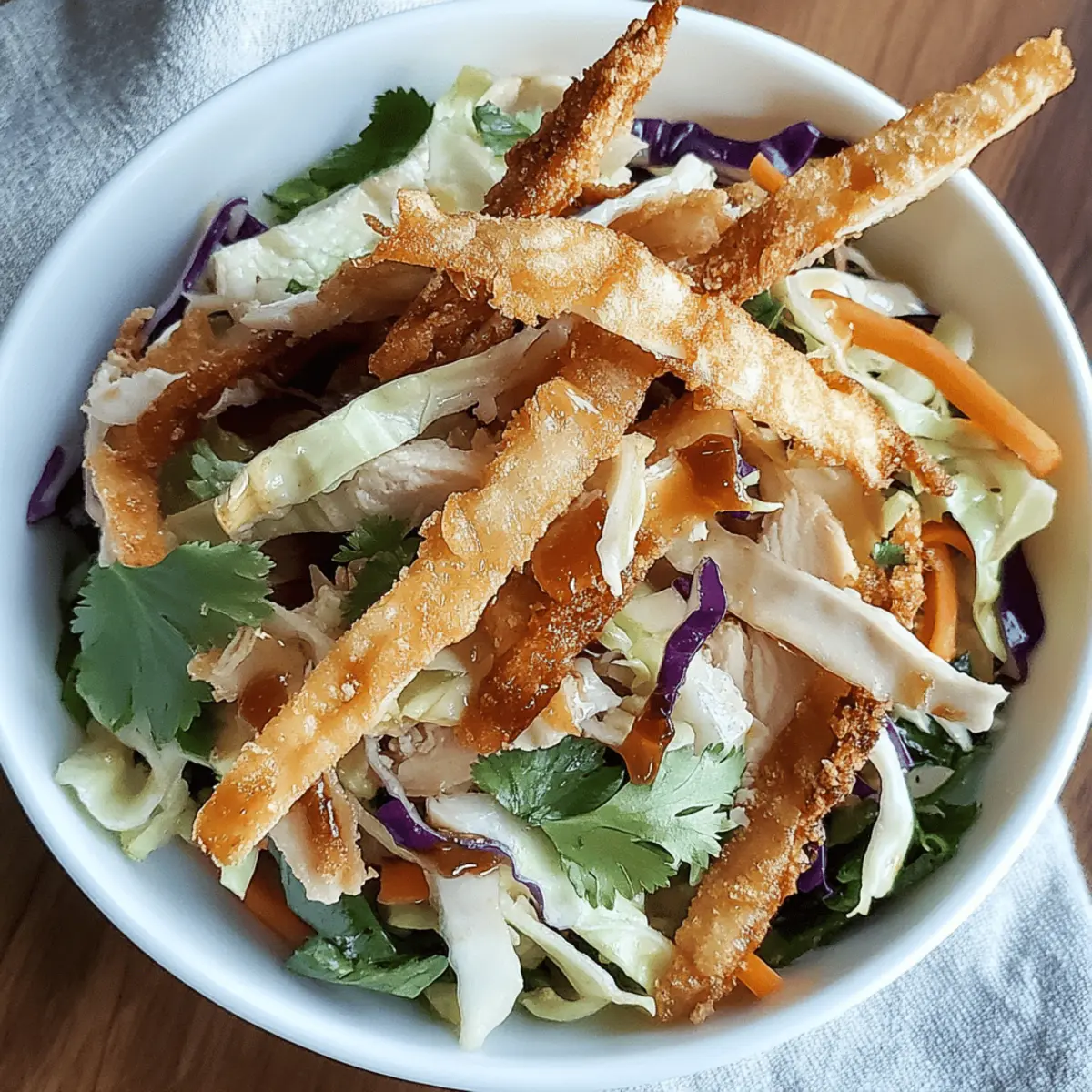 Just before serving, generously top your salad with the crispy wonton strips you prepared earlier. This adds an irresistible crunch that contrasts beautifully with the tender chicken and fresh vegetables. The wontons are essential for that delightful texture that makes this dish truly stand out.
