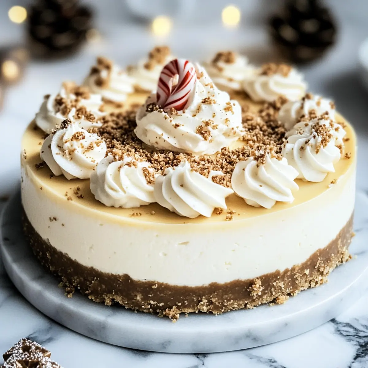 7. Whip heavy cream until soft peaks form and spread on top of cheesecake. Sprinkle with nutmeg, cinnamon or candy canes.