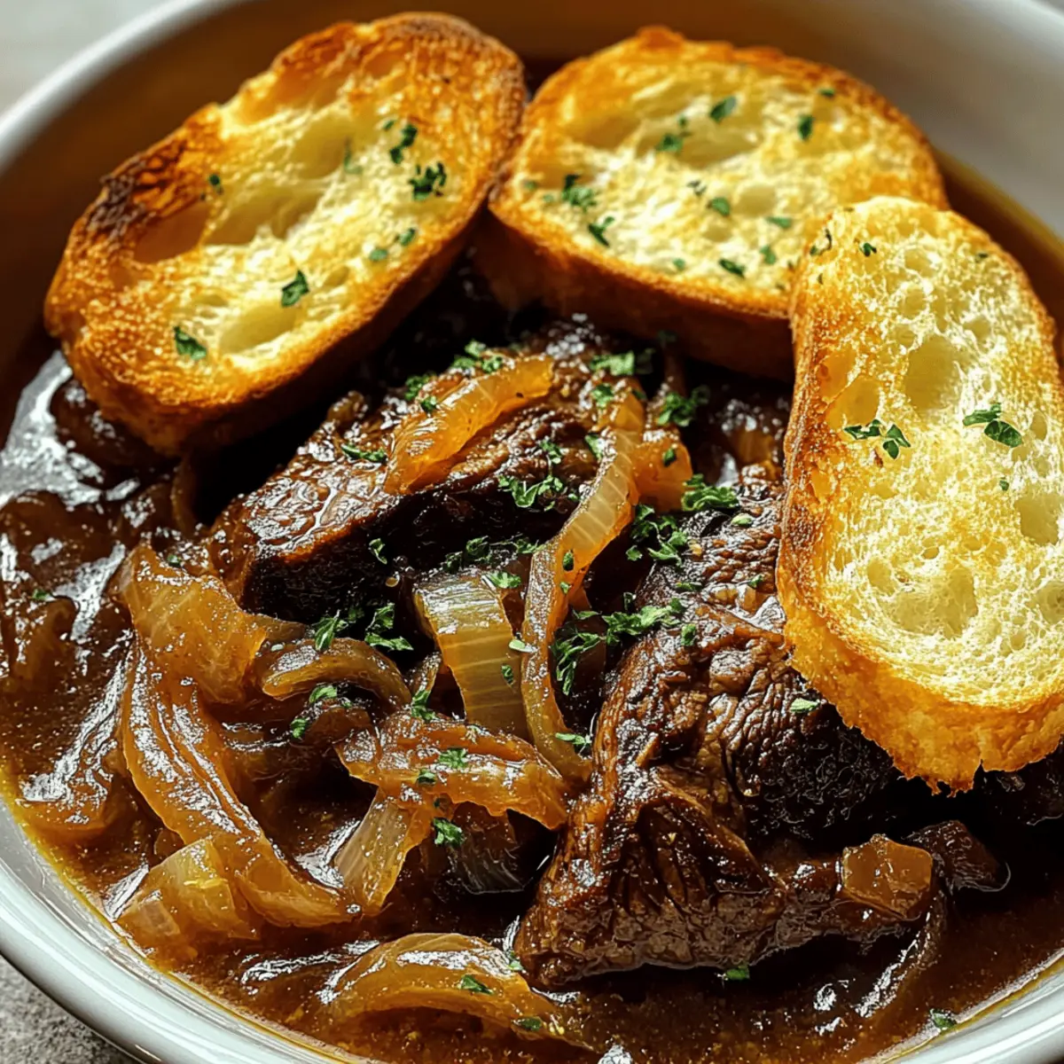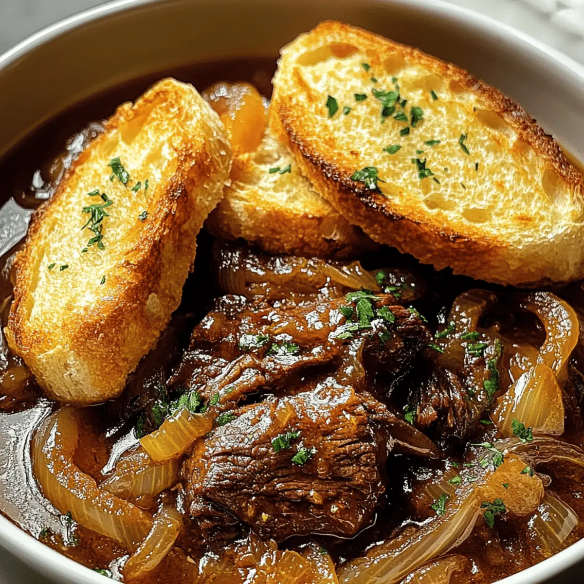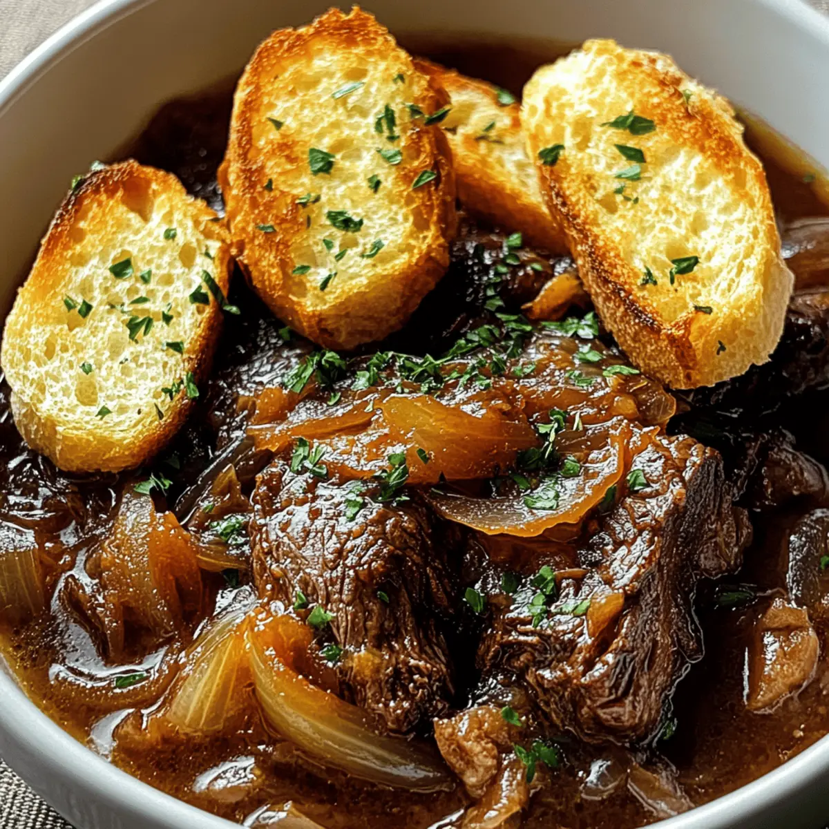 The savory aroma of slowly braised beef and caramelized onions wafting through the kitchen instantly transports me to cozy family dinners and laughter-filled gatherings. This French Onion Braised Beef recipe transcends a mere meal; it embodies comfort food at its finest, marrying rich flavors and tender bites. With just a few simple steps, even novice cooks can master this dish, making it a delightful centerpiece for any occasion. The addition of cheesy crostini adds a playful touch, transforming your dinner table into a feast of warmth and joy. It’s not only hearty and filling but also perfect for meal prepping, ensuring you have delicious leftovers to enjoy later. Intrigued about how to achieve this cozy delight? Let’s dive into the recipe! Why is This Recipe a Must-Try? Comforting Warmth: This dish captures the essence of cozy nights at home, filled with rich flavors and tender beef. Easy Preparation: With straightforward steps, even beginners can confidently create a show-stopping meal. Crowd-Pleasing Addition: Pair it with French Toast Sausage for a delightful brunch or savor it alongside creamy mashed potatoes to satisfy any appetite. Flavorful Versatility: The recipe invites variations, whether you choose to add vegetables or swap beef for pork shoulder. Delicious Leftovers: Enjoy the convenience of meal prep as this dish stores beautifully, allowing you to relish it for days! Rich Texture: The combination of melting beef, jammy onions, and crispy crostini creates a lavish eating experience perfect for gathering with friends and family. French Onion Braised Beef Ingredients For the Braise Neutral Oil – For sautéing the beef; can be swapped with olive oil if preferred. Beef Chuck Roast – The star protein, ideally suited for braising due to its tenderness; avoid lean cuts to prevent dryness. Butter – Adds a rich flavor while caramelizing the onions; can be reduced for a lighter touch. Yellow Onions – Essential for the dish’s sweetness and depth; shallots make a great substitute for a milder flavor. Garlic Cloves – Amplifies the savory profile; use garlic powder as a quick alternative if needed. Dijon Mustard – Brings a slight tang and complexity; swap with yellow mustard in a pinch. Worcestershire Sauce – Infuses umami essence; liquid aminos can stand in for a similar flavor. All-Purpose Flour – Thickens the braising liquid; opt for gluten-free flour if necessary. Dry White Grape Juice – Offers a delightful sweetness balanced with acidity; white wine or apple cider is a suitable alternative. Beef Stock – The backbone of the savory broth; vegetable stock can lighten the dish if desired. Fresh Bay Leaves – Provide an aromatic quality to the broth; use fewer dried bay leaves for similar benefits. Thyme Sprigs – Complementary herbal freshness; rosemary can be used in place of thyme if needed. Kosher Salt & Black Pepper – Essential for enhancing overall flavor; use sea salt and fresh pepper for the best results. For the Cheesy Crostini Demi Baguette – Perfect for creating chewy, cheesy crostini; any sturdy bread like ciabatta will work well. Olive Oil – For brushing the bread before toasting; melted butter is a tasty alternative. Gruyere Cheese – Melts beautifully to top the crostini; Swiss or mozzarella can substitute. Fresh Thyme Leaves – For garnishing, adding a pop of color and flavor; omit or use dried thyme if preferred. This French Onion Braised Beef recipe brings the warmth and coziness that comfort food lovers crave, ensuring delightful bites with each serving! Step‑by‑Step Instructions for French Onion Braised Beef Step 1: Preheat the Oven Begin by preheating your oven to 350°F (175°C). This temperature sets the stage for slow cooking, ensuring the beef becomes tender and infused with flavor. While the oven heats up, prepare your ingredients so everything is ready when it’s time to start cooking. Step 2: Sear the Beef In a large, heavy-bottomed pot, heat a couple of tablespoons of neutral oil over medium-high heat. Once shimmering, carefully place the beef chuck roast in the pot and sear it for about 4-5 minutes on each side until a rich brown crust forms. This step enhances the overall flavor of your French Onion Braised Beef. Step 3: Caramelize the Onions After the beef is nicely browned, remove it from the pot and set it aside on a plate. Lower the heat to medium, adding butter to the pot. Then, toss in sliced yellow onions and minced garlic, stirring frequently for about 10-15 minutes until the onions are golden and softened, creating a sweet and fragrant base. Step 4: Build the Flavor Once your onions are caramelized, stir in Dijon mustard, Worcestershire sauce, and a sprinkle of all-purpose flour. Allow this mixture to cook for about 1-2 minutes, stirring constantly to blend the flavors without burning. This will help thicken the braising liquid while enhancing the richness of your French Onion Braised Beef. Step 5: Deglaze the Pot Next, pour in dry white grape juice, using a wooden spoon to scrape up any browned bits from the bottom of the pot. This deglazing process adds depth to the dish. Allow the juice to simmer for a minute before adding the beef stock. The combined flavors will create a savory foundation for the braise. Step 6: Add the Herbs Now, return the seared beef to the pot, nestling it into the flavorful onion mixture. Toss in fresh bay leaves and thyme sprigs for aromatic notes. Season generously with kosher salt and black pepper, making sure to coat the beef well with the herbs and seasoning, enhancing the overall taste of your French Onion Braised Beef. Step 7: Braise the Beef Cover the pot with a tight-fitting lid and transfer it to your preheated oven. Let it braise for about 3 hours, or until the beef is fork-tender and the flavors have melded beautifully. Check occasionally to ensure there’s enough liquid; add a splash of water if needed to keep it moist. Step 8: Prepare the Crostini About 15 minutes 