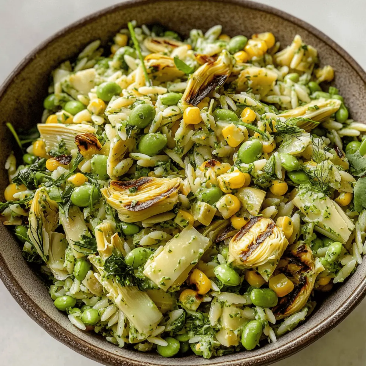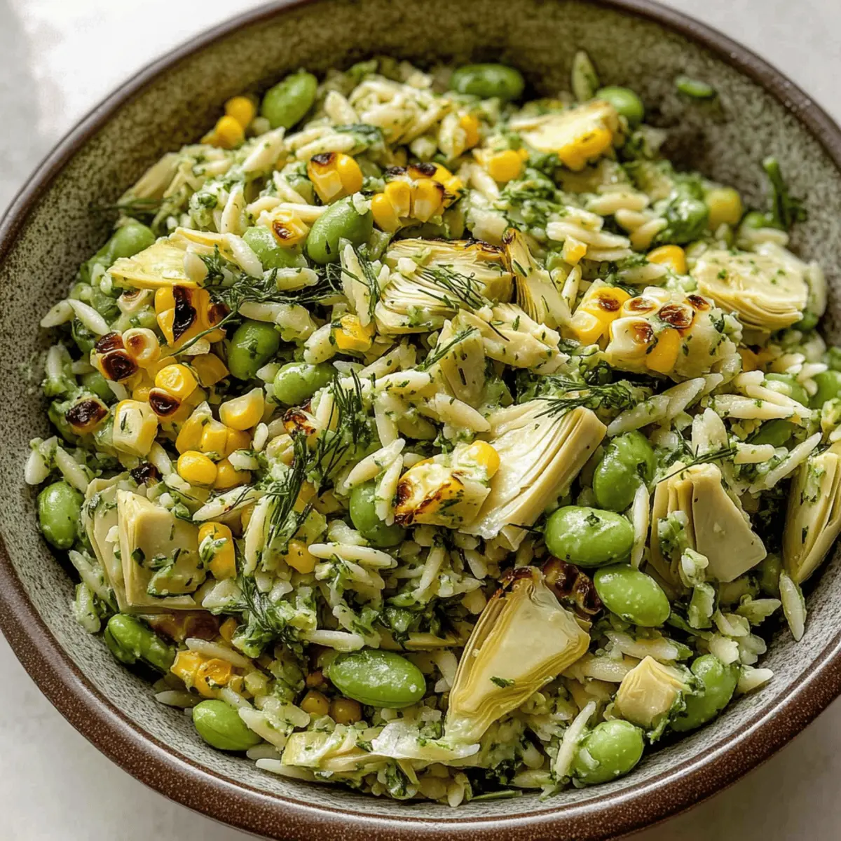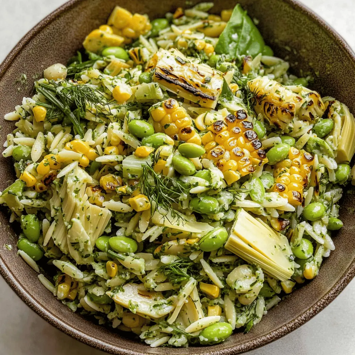 The sun-kissed days of summer always bring back delightful memories of backyard gatherings, and nothing says “refreshing” quite like a bowl of Grilled Corn Orzo Salad with Scallion Dill Dressing. Picture tender orzo pasta mingling with the sweetness of grilled corn and a creamy scallion-dill dressing—it’s a plant-based symphony that makes every bite truly uplifting. This salad cleverly combines the lightness of fresh ingredients, making it not just a side, but a satisfying meal option perfect for barbecues or picnics. Packed with fiber and bursting with plant protein, it’s an easy and compelling choice for those looking to swap fast food for something wholesome. What creative twists will you try to make it your own? Why is this salad a must-try? Deliciously Versatile: The Grilled Corn Orzo Salad adapts beautifully to your tastes. Whether you prefer chickpeas or extra herbs, it welcomes your creativity! Quick Prep Time: With simple steps and easy-to-find ingredients, you can whip this up in no time, taking the hassle out of meal prep. Bright and Flavorful: The creamy scallion-dill dressing perfectly complements the sweetness of the corn, creating a delightful taste experience that’s hard to resist. Perfect for Gatherings: Serve this salad as a showstopper at BBQs or potlucks, appealing to vegans and non-vegans alike! Meal Prep Friendly: Enjoy leftovers for lunch—this salad stores well and tastes even better the next day. Don’t forget to try it with a refreshing Strawberry Spinach Salad for a colorful side! Grilled Corn Orzo Salad Ingredients For the Salad Orzo – This small pasta provides structure; feel free to substitute with any small pasta or gluten-free quinoa. Corn – Adds sweetness and crunch; fresh or grilled corn works best, but frozen charred corn is a quick alternative. Scallions – These lend a mild onion flavor, but you can use sautéed shallots or marinated red onions if you prefer. Edamame – A great source of plant protein; swap in fava beans or white beans if needed. Artichoke Hearts – Adds depth; opt for jarred marinated hearts or substitute with sun-dried tomatoes or capers. Arugula – Provides a delicious peppery bite; baby spinach or kale can work as substitutes. For the Dressing Miso Paste – This ingredient gives the dressing savory umami flavor; in a pinch, try nutritional yeast and salt or a teaspoon of Dijon mustard. Oil – Use avocado oil for grilling and extra virgin olive oil for the dressing, or swap in any neutral oil. Lemon – Fresh juice and zest enhance the dish’s flavor; bottled lemon juice is a fine substitute if you’re in a rush. Herbs – Dill and oregano create a delightful flavor base; feel free to switch to fresh basil or parsley. Optional Additions Vegan Parm – Adds a cheesy flavor for those who want it; nutritional yeast can serve as a fantastic alternative. Now that you’re set with the ingredients, it’s time to bring this Grilled Corn Orzo Salad with Scallion Dill Dressing to life! Step‑by‑Step Instructions for Grilled Corn Orzo Salad with Scallion Dill Dressing Step 1: Cook Orzo Begin by bringing a large pot of salted water to a rolling boil. Add the orzo and cook it according to the package instructions until it reaches al dente, which typically takes around 8-10 minutes. Once cooked, drain the orzo in a colander and rinse it under cold water to halt the cooking process. Set aside to cool completely. Step 2: Grill Corn Preheat your grill to medium heat, around 400°F (204°C). Place the corn cobs directly on the grill and cook for 10-12 minutes, turning occasionally until the kernels are slightly charred and tender. When done, remove the corn from the grill and allow it to cool for a few minutes. Once cool, carefully slice the kernels off the cob and set them aside. Step 3: Sear Scallions and Garlic In a skillet over medium heat, add a drizzle of oil and toss in the white parts of the scallions. Sear them for about 1-2 minutes until they start to soften. Next, add minced garlic to the skillet and sauté until golden, which should take another 1-2 minutes. Remove from heat and allow the mixture to cool off slightly. Step 4: Make Dressing In a blender, combine the grilled garlic and scallions, lemon zest, lemon juice, a splash of vinegar, extra virgin olive oil, miso paste, and a pinch of salt. Blend the mixture until it’s smooth and creamy, then fold in the fresh dill. This scallion dill dressing will add a delightful richness to your Grilled Corn Orzo Salad. Step 5: Assemble Salad In a large mixing bowl, combine the cooled orzo, grilled corn kernels, remaining green scallions, artichoke hearts, edamame, and any fresh herbs you’re using. Pour the creamy scallion dill dressing over the salad. Gently toss everything together until the ingredients are well coated, adjusting seasoning as needed with salt and pepper. Step 6: Serve or Store Transfer your vibrant Grilled Corn Orzo Salad to a serving platter or bowl. It can be enjoyed immediately, or you can refrigerate it in an airtight container for up to 4 days, allowing the flavors to meld beautifully. When ready to serve, sprinkle with vegan parmesan for an extra touch of flavor! Grilled Corn Orzo Salad Variations Feel free to get creative and make this salad your own with these delicious twists! Herb Swap: Experiment with fresh cilantro or basil for a new flavor profile that brightens the dish. Chickpea Boost: Substitute edamame with chickpeas for added protein and a hearty touch. Nutty Crunch: For a delightful texture twist, sprinkle some toasted almonds or walnuts on top. Spicy Kick: Add a pinch of red pepper flakes to the dressing for a zesty heat that ignites your taste buds. Vegan Caesar: Mix in some capers and lemon zest for a robust flavor reminiscent of a classic Caesar salad. Mediterranean Flare: Replace artichoke hearts with sun-dried tomatoes and fresh olives for a Mediterranean vibe. Creamy Avocado: Add diced avocado for a creamy texture tha