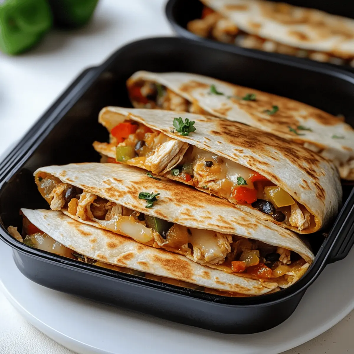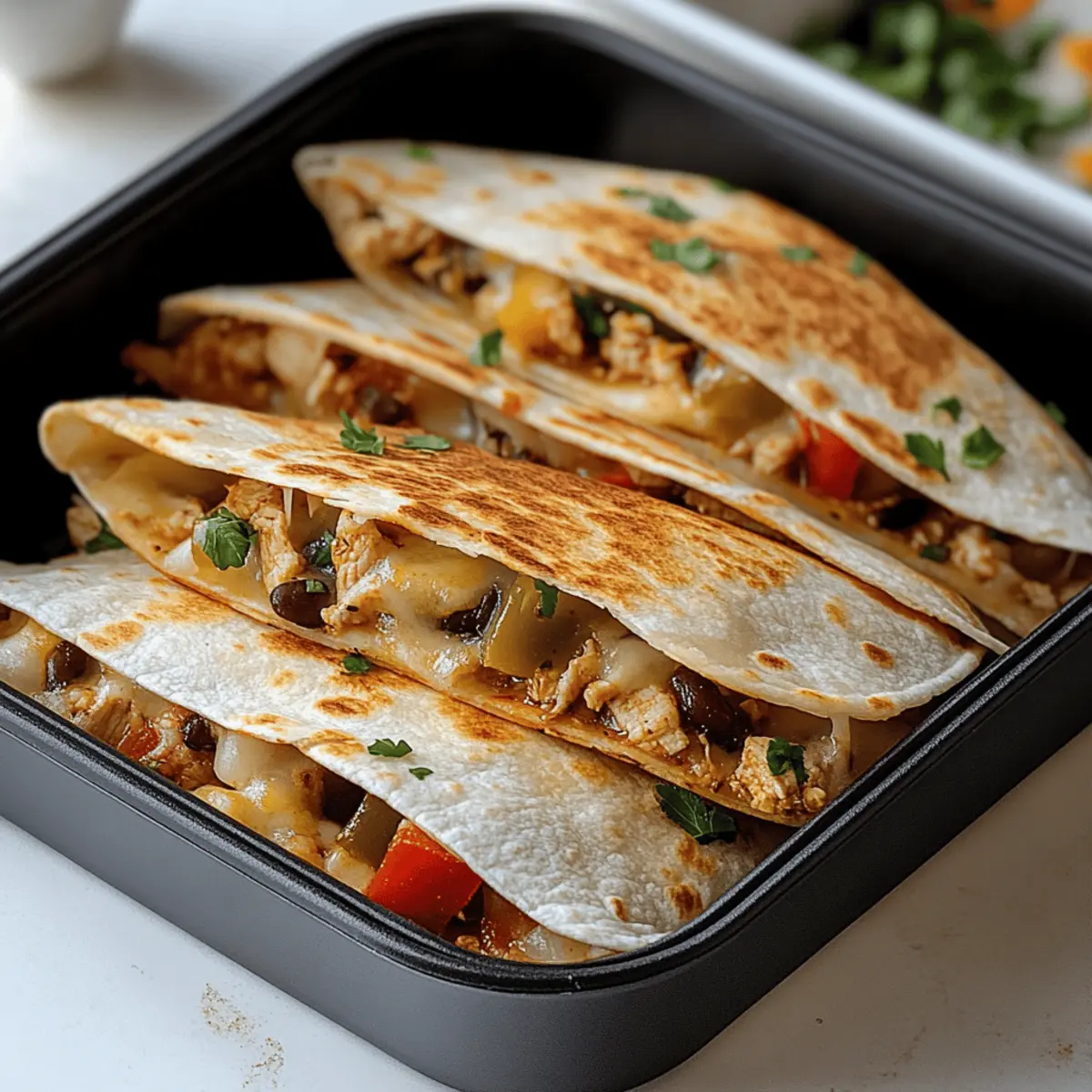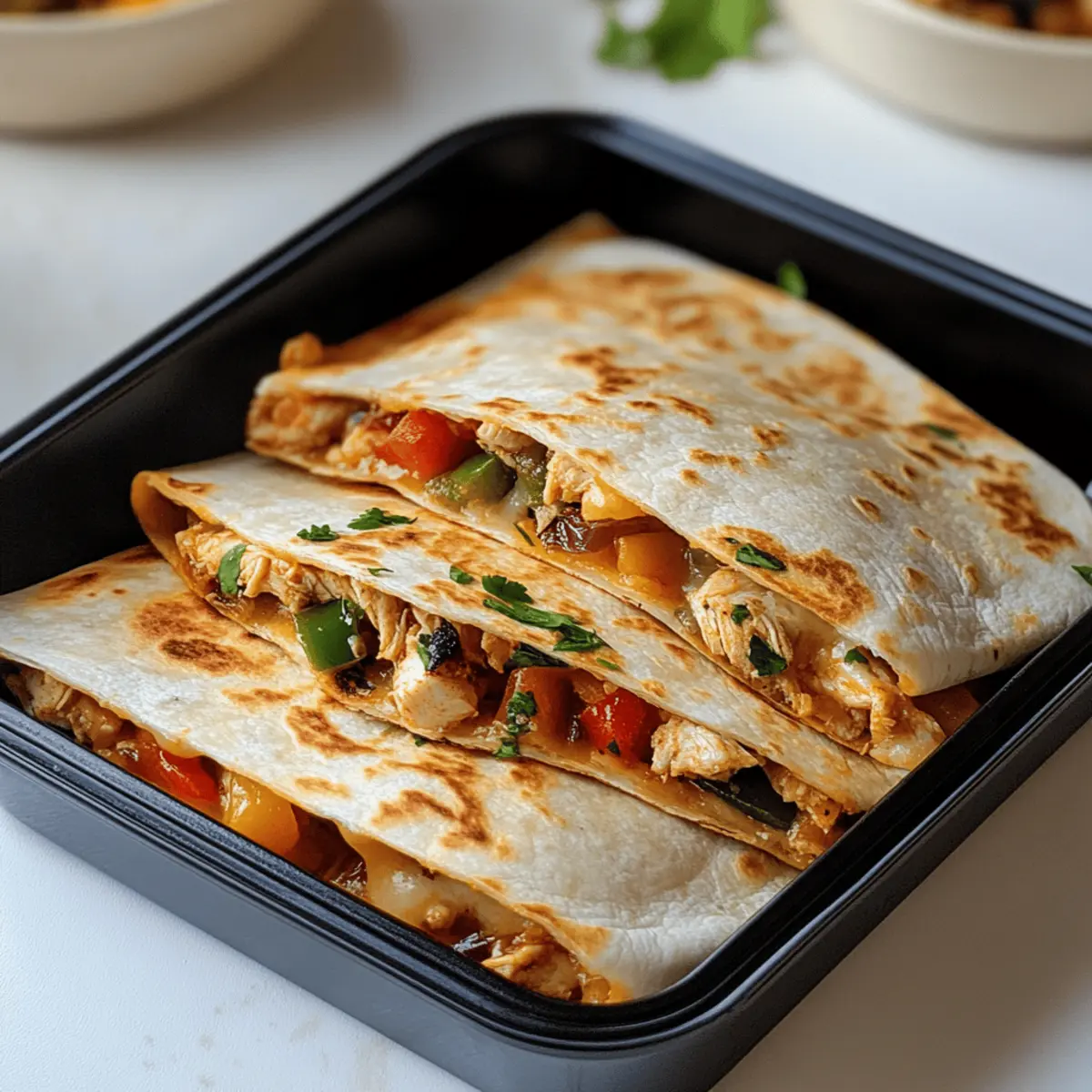 As I stood in my kitchen, the tantalizing aroma of sautéed onions and garlic wafted through the air, transporting me to a cozy taco shop, where happiness wraps itself in warm tortillas. If you’re on the hunt for a delightful yet Healthy Baked Chicken Quesadilla recipe, prepare to be thrilled! This dish is perfect for those busy weeknights, as it boasts quick prep and versatile ingredients that can be tailored to suit your taste buds. With just a few simple steps, the oven handles the work, granting you much-deserved downtime while savoring crispy, gooey perfection. Plus, it’s easy to swap the chicken for tofu or tempeh if you prefer a vegetarian or vegan twist! Are you ready to transform dinner into a delicious, wholesome adventure? Why Choose This Healthy Quesadilla? Quick and Easy: This recipe is a breeze to whip up, perfect for weeknight meals when you need to save time without sacrificing flavor. Versatile Options: Whether you’re craving chicken, want to try a vegetarian version with tofu, or need a gluten-free alternative with corn tortillas, this recipe adapts to your needs. Flavor-Packed Filling: The combination of sautéed onions, garlic, and capsicum enhances the dish with layers of savory goodness that will impress your taste buds. Crispy Delight: Baking, rather than frying, results in golden, crispy quesadillas that are healthier and easier to manage. Crowd-Pleaser: Serve these quesadillas at your next gathering or family dinner; everyone will love customizing their own with salsa, guacamole, or sour cream. If you’re looking for more healthy options, check out Grilled Chicken Healthy or indulge in some Cheesy Chicken Quesadillas for variety. Healthy Baked Chicken Quesadilla Ingredients For the Filling • Chicken – A rich protein source; substitute with firm tofu or tempeh for a vegetarian or vegan option. • Olive Oil – Ideal for sautéing to get that perfect golden color; any neutral cooking oil also works well. • Onion – Adds essential flavor and sweetness; can be swapped for shallots or green onions if desired. • Garlic – Elevates the dish with a robust taste; both fresh and powdered garlic are great alternatives. • Capsicum (Bell Pepper) – Brings sweetness and crunch; feel free to use any color or try spinach for a different spin. For the Quesadillas • Tortillas – The base of your quesadillas; use flour or corn tortillas for a gluten-free option, and remember to warm them to prevent cracking. • Shredded Cheese – Provides that wonderful melty texture; consider a reduced-fat version or nutritional yeast for a lower-fat alternative. With these ingredients, you’re just steps away from crafting a delightful Healthy Baked Chicken Quesadilla that satisfies and delights everybody at the dinner table! Step‑by‑Step Instructions for Healthy Baked Chicken Quesadilla Step 1: Prepare the Chicken Filling In a bowl, combine diced chicken with a drizzle of olive oil, minced garlic, and your choice of seasonings. Mix thoroughly until the chicken is evenly coated. This savory mixture sets the stage for your Healthy Baked Chicken Quesadilla, delivering flavor from the start. Step 2: Sauté the Aromatics Heat a skillet over high heat and add a splash of olive oil. Once shimmering, drop in chopped onions and sauté for about 1 minute until fragrant and slightly translucent. The high heat brings out the sweetness in the onions, creating a perfect base for your quesadilla filling. Step 3: Add the Capsicum Next, mix in the chopped capsicum (bell pepper) with the sautéed onions and garlic. Cook for another 2 minutes, stirring occasionally, until the capsicum softens and brightens in color. This adds both sweetness and crunch to your Healthy Baked Chicken Quesadilla filling. Step 4: Cook the Chicken Remove the sautéed vegetables from the skillet and transfer them to a bowl. Return the skillet to the heat and cook the marinated chicken for about 6-8 minutes, stirring until browned and cooked through. You’ll know it’s ready when the chicken is golden and no longer pink inside. Step 5: Combine the Filling Once the chicken is cooked, fold the sautéed vegetables back into the skillet with the chicken. Mix everything thoroughly to ensure that the flavors meld beautifully. Allow this filling to cool slightly on a plate or in the refrigerator to avoid soggy tortillas in your Healthy Baked Chicken Quesadilla. Step 6: Preheat the Oven While the filling is cooling, preheat your oven to 220°C (430°F) or 200°C (390°F) for fan/convection settings. Prepare a baking tray by drizzling it with a bit of olive oil or lining it with parchment paper. A preheated oven ensures that your quesadillas become beautifully crispy. Step 7: Assemble the Quesadillas Take a tortilla and place half of the filling mixture on one side. Sprinkle generous amounts of shredded cheese on top of the filling before folding the tortilla over. Press gently to secure the filling, creating a delicious pocket that will hold up during baking. Step 8: Bake to Golden Perfection Arrange the quesadillas on the prepared baking tray and slide them into your preheated oven. Bake for approximately 8 minutes until the bottoms are golden, then flip each quesadilla and bake for an additional 8 minutes. Your Healthy Baked Chicken Quesadillas are almost ready! Step 9: Serve and Relish Once golden and crispy, remove them from the oven and let them cool slightly. Slice each quesadilla into wedges and serve hot, accompanied by salsa, guacamole, or sour cream for an extra pop of flavor. Enjoy every bite of your homemade Healthy Baked Chicken Quesadilla! What to Serve with Healthy Baked Chicken Quesadilla Enhance your weeknight dinner experience with delicious side dishes that perfectly complement this wholesome quesadilla. Creamy Guacamole: This creamy dip adds a rich, buttery flavor, perfect for balancing the quesadilla’s crunch and spice. Fresh Salsa: Bright, tangy, and refreshing, a side of homemade salsa bri