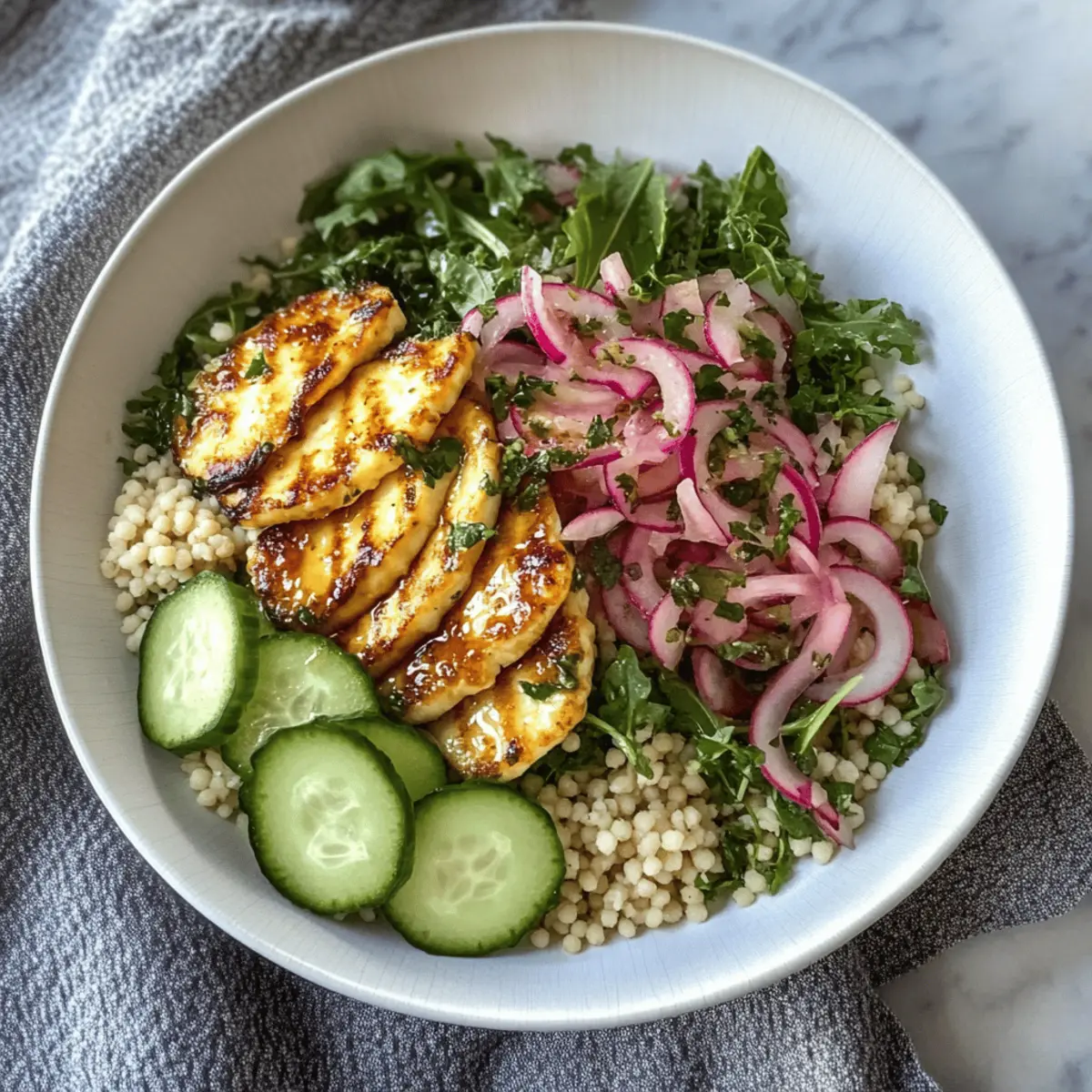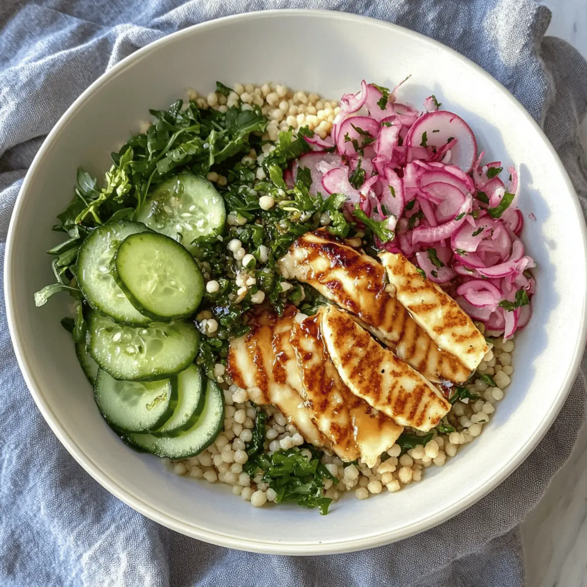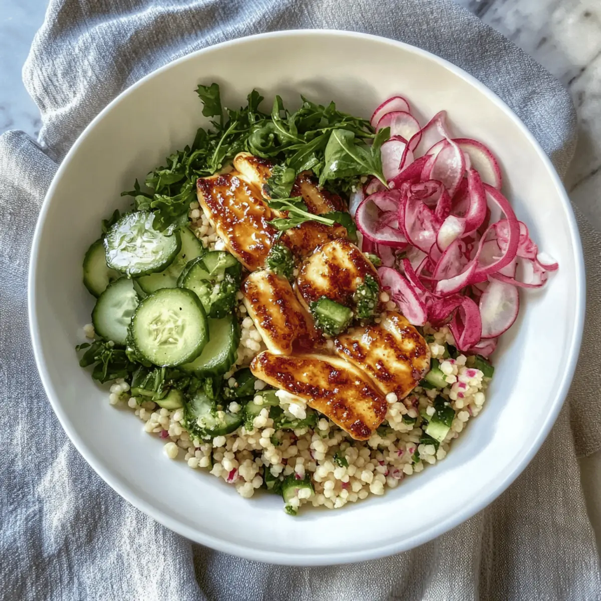 As spring tiptoes in, I find myself craving vibrant dishes that celebrate the season. That’s where my Hot Honey Halloumi and Couscous Salad comes into play—a delightful combination that balances the creamy, slightly salty halloumi with a spicy-sweet kick from hot honey. This vegetarian, gluten-free gem not only comes together in a flash, but it also delivers a nutrient-packed punch with fresh greens and fiber-rich veggies. Ideal for a light lunch or as a stunning side for your next dinner gathering, this salad captures the essence of spring on your plate. Ready to dive into a taste adventure that’s both delicious and nutritious? Let’s get started! Why is this salad a must-try? Bursting with Flavor: The unique combination of halloumi and hot honey brings a delightful spicy-sweet kick that keeps your taste buds excited. Quick and Easy: You can whip this up in no time, making it a perfect choice for busy weeknights or impromptu gatherings. Nutrient-Packed: With ingredients like arugula, spinach, and cucumbers, this salad is not just tasty but also brimming with vitamins and minerals. Versatile Dish: Whether served as a light lunch or a stunning side for grilled meats, it adapts beautifully to your dining needs. Crowd-Pleaser: Its vibrant colors and delicious taste make it an impressive addition to any table, guaranteed to wow guests. Elevate your meal prep with this salad, or explore other fresh options like Fruit Salad Honey and Bbq Chicken Salad. Hot Honey Halloumi Salad Ingredients Ready to create the delightful Hot Honey Halloumi and Couscous Salad? Here’s everything you need! For the Salad Red Onion – Adds sweetness and depth; marinate in sumac and olive oil for enhanced flavor. Extra Virgin Olive Oil – For marinating and dressing, providing healthy fats to nourish your body. Sumac – Offers tanginess with a unique lemony flavor; adjust to your taste preference for that extra zing. Aleppo Pepper – Adds mild spice and complexity to the onion marinate; perfect for a flavorful kick. Salt – Enhances the flavor of all ingredients; don’t be shy—adjust to taste! Dry Pearled Couscous – Acts as a hearty, gluten-free base; feel free to substitute with quinoa for a different texture. Arugula – Adds peppery notes and freshness; can be swapped with kale if you prefer. Spinach – Brings mild earthiness and nutrients; can be omitted or replaced with other greens. Cucumber – Provides crunch and hydration; use your favorite variety for that refreshing bite. Halloumi Cheese – Offers a creamy, savory component; for a vegan option, try using tofu. Lemon Juice – Brightens flavors and brings everything together; always use fresh for the best outcome. Mike’s Hot Honey – Infuses sweet heat; use regular honey mixed with red pepper flakes as a substitute if needed. Fresh Parsley – Adds freshness and color to the dressing; cilantro or other herbs work just as well. Water – To dilute the dressing for your desired consistency; adjust based on what you like. Now that you have your ingredients ready, let’s whip up a salad that’s not just a dish—it’s an experience! Step‑by‑Step Instructions for Hot Honey Halloumi and Couscous Salad Step 1: Marinate Onions In a medium bowl, combine sliced red onions with extra virgin olive oil, sumac, Aleppo pepper, and salt. Toss until the onions are well coated, allowing the flavors to meld. Cover the bowl and let it marinate for at least 30 minutes at room temperature, allowing the onions to soften and absorb the delicious seasonings. Step 2: Prepare Couscous Bring 1 cup of water to a boil in a saucepan over medium-high heat, adding a drizzle of olive oil and a pinch of salt. Stir in the dry pearled couscous, then reduce heat to low and cover. Let it cook for about 10 minutes until the couscous absorbs the water and becomes fluffy. Once done, remove from heat and fluff with a fork. Step 3: Chop Vegetables While the couscous is cooking, finely chop the arugula and spinach. In a large serving bowl, add these greens to the bottom and arrange sliced cucumber on the top for a visually appealing presentation. The vibrant colors from the greens and cucumber will bring a fresh element to your Hot Honey Halloumi and Couscous Salad. Step 4: Cook Halloumi In a small bowl, whisk together lemon juice, hot honey, and a drizzle of olive oil. Slice the halloumi cheese into thick pieces and soak them in the mixture for about 5 minutes. Heat a non-stick skillet over medium heat, and sear the halloumi for 2-3 minutes on each side until golden brown and crispy—this adds a delicious savory dimension to your salad. Step 5: Make Dressing In a separate small bowl, combine chopped fresh parsley, olive oil, remaining lemon juice, salt, and a splash of water. Whisk until well blended and the dressing reaches your desired consistency. This bright and zesty dressing will enhance the flavors in your Hot Honey Halloumi and Couscous Salad just perfectly. Step 6: Assemble the Salad In the large bowl with greens and cucumber, add the fluffy couscous and marinated onions, tossing gently to combine all the ingredients. Finally, place the crispy halloumi on top. Drizzle the fresh dressing over the salad, ensuring every bite is infused with flavor. Serve immediately, or allow it to sit for a moment to let the flavors blend beautifully. Hot Honey Halloumi Salad Variations Feel free to get creative with this recipe and make it your own! The possibilities are endless, and every twist adds a unique touch. Protein Boost: Top your salad with grilled shrimp or chicken for an extra layer of protein. The smoky flavor pairs beautifully with the sweetness of the hot honey. Vegan Option: Swap halloumi cheese for paneer or tofu to keep things vegan while maintaining that creamy texture. Just ensure to marinate tofu to infuse it with flavor! Roasted Veggies: Add some roasted bell peppers or zucchini for a warm, earthy contrast to the fresh greens. These veggies not only enhance