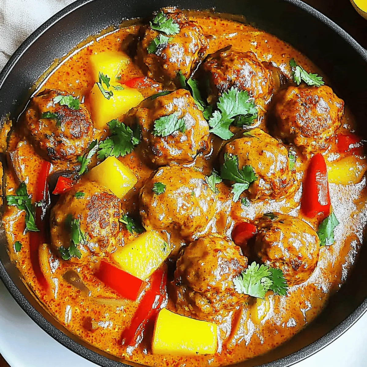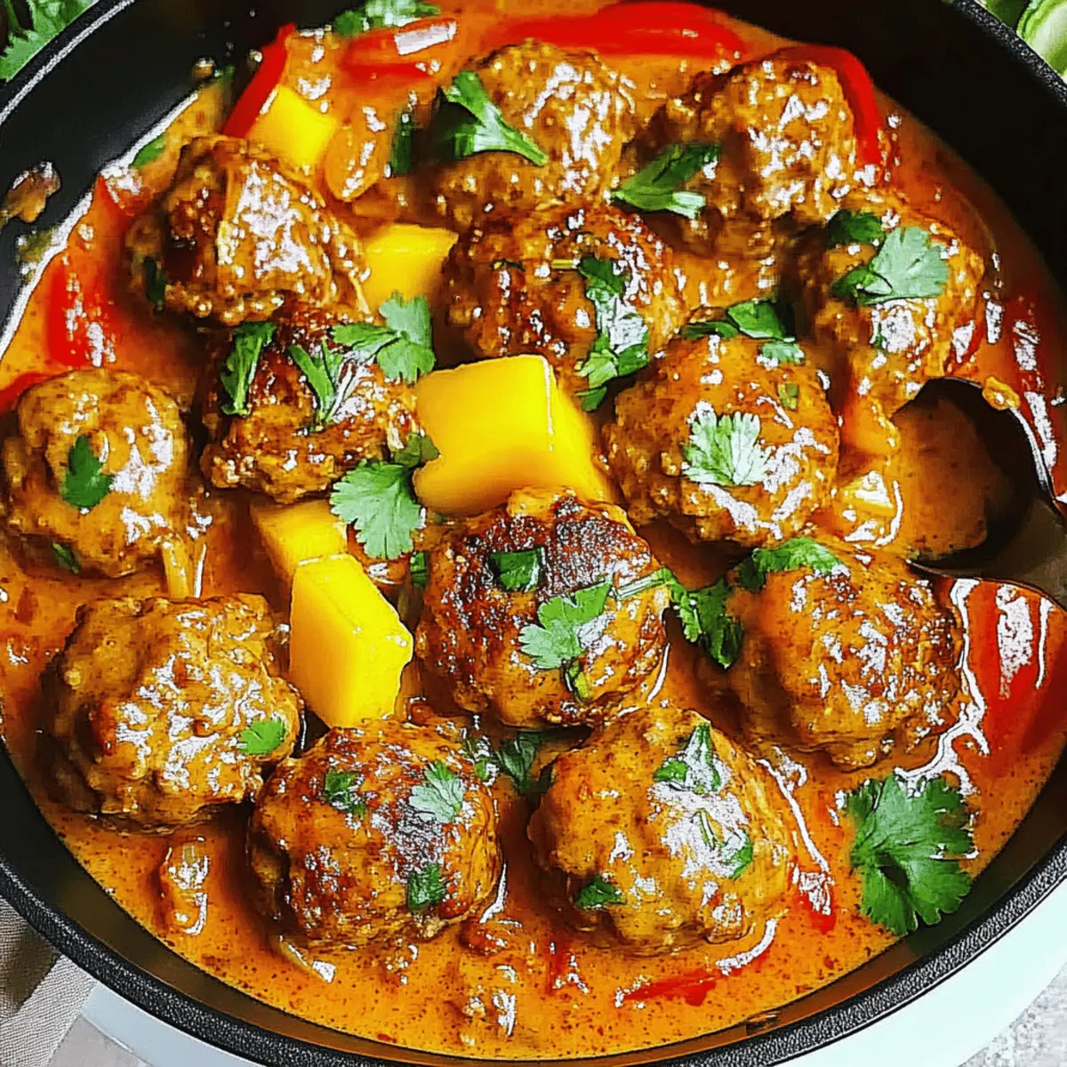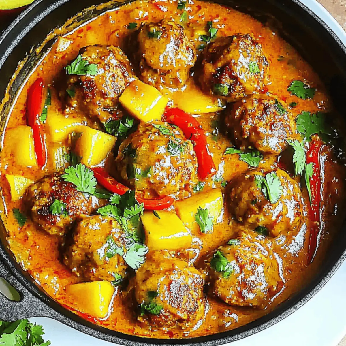 As I stood in my kitchen, the fragrant aroma of coconut and spices wafted through the air, instantly transporting me to a bustling Thai market. Today, I’m thrilled to share a recipe that has quickly become a family favorite: Mango Thai Red Curry Meatballs. This dish combines the tender juiciness of meatballs with a delightful coconut curry sauce, all harmonized by the sweetness of fresh mango. Not only does it come together in just 30 minutes, making it perfect for busy weeknights, but it also brings an authentic taste of Thai cuisine right to your dinner table without any fuss. Whether you’re a seasoned home chef or just looking to break free from fast food, this dish is bound to satisfy your cravings. Curious about how to whip up this deliciousness? Let’s dive in! Why Try Mango Thai Red Curry Meatballs? Experience the perfect blend of flavors! Infused with aromatic spices and a creamy coconut sauce, these meatballs are a luxurious treat. Quick Prep means you can whip up this gourmet dish in just 30 minutes, making it ideal for busy nights. Versatile Ingredients allow you to easily adapt the recipe to suit your taste—try ground chicken or even tofu for a lighter or vegetarian version! Crowd-Pleasing nature ensures this dish will be a hit at your next dinner party or family gathering; everyone loves a comforting curry! Don’t forget to serve it over cauliflower rice to keep things light or alongside a refreshing Mango Lemonade for a complete meal. Mango Thai Red Curry Meatballs Ingredients For the Meatballs Ground Beef – The main protein source; substitute with ground chicken or turkey for a lighter option. Salt and Pepper – Essential for flavor enhancement; use sea salt for a finer taste. Red Pepper Flakes – Adds a touch of heat; adjust based on your preference for spice. Cauliflower Rice – A low-carb alternative to regular rice; can be swapped with white rice or quinoa. Onions – Provides sweetness and depth; shallots can be used for a milder flavor. Chopped Cilantro – Adds a fresh herbal note; basil can substitute for a different twist. Minced Ginger – Delivers warmth and spice; ground ginger works in a pinch, but fresh is ideal. Minced Garlic – Imparts a pungent flavor; can be substituted with garlic powder if needed. For the Sauce Coconut Oil – Adds richness when cooking; can be swapped with avocado or olive oil. Bell Peppers – Offer sweetness and crunch; any color works, or substitute with zucchini. Coconut Milk – Acts as a creamy sauce base; use full-fat for richness or light coconut milk for fewer calories. Red Curry Paste – Essential for authentic Thai flavor; look for vegan options or make your own. Fish Sauce – Adds umami depth; soy sauce can replace it for a vegetarian version. Coconut Aminos – A sweet and salty alternative to soy sauce, enhancing flavor complexity. Chopped Mango – Provides natural sweetness; fresh is best, though frozen works too. Coconut Sugar – Sweetens the sauce; brown sugar or honey can be used as substitutes. Step‑by‑Step Instructions for Mango Thai Red Curry Meatballs Step 1: Preheat the Oven Begin by preheating your oven to 400°F (200°C). This will ensure the Mango Thai Red Curry Meatballs bake evenly and achieve a delightful golden brown exterior. While the oven heats up, prepare the baking sheet by lining it with parchment paper or lightly greasing it with cooking spray to prevent sticking. Step 2: Make Meatballs In a large mixing bowl, combine ground beef, salt, pepper, red pepper flakes, cauliflower rice, onions, chopped cilantro, minced ginger, and minced garlic. Mix thoroughly until all ingredients are well distributed. Using your hands, form the mixture into 1-inch meatballs, placing them on the prepared baking sheet. You should have about 20 meatballs ready for baking. Step 3: Bake Meatballs Once the oven reaches temperature, place the baking sheet with meatballs into the oven. Bake for approximately 20 minutes, or until the meatballs are browned and firm to the touch. You want them to be cooked through but still juicy, so keep an eye on them as they bake to avoid overcooking. Step 4: Prepare Sauce While the meatballs are baking, heat coconut oil in a large skillet over medium heat. Once hot, add sliced bell peppers, onions, and minced ginger. Sauté for about 5 minutes until the vegetables are tender and fragrant. Stir frequently, allowing the peppers to soften while enhancing the overall flavor of the sauce. Step 5: Combine Sauce Ingredients Now, stir in the creamy coconut milk, red curry paste, fish sauce, coconut aminos, chopped mango, and coconut sugar into the skillet. Mix well and let the sauce simmer gently over low heat, allowing the flavors to meld together. This should take about 5 minutes, ensuring everything is nicely incorporated. Step 6: Finish Dish When the meatballs are fully cooked, remove them from the oven and transfer them into the skillet with the sauce. Gently stir the meatballs to coat them with the rich Mango Thai Red Curry sauce. Allow the dish to cook for an additional few minutes until everything is heated through, making sure the meatballs soak in all the incredible flavors. How to Store and Freeze Mango Thai Red Curry Meatballs Room Temperature: Avoid leaving meatballs out for more than 2 hours after cooking to prevent spoilage; it’s best to refrigerate promptly. Fridge: Store in an airtight container for up to 3 days. Reheat in the microwave or on the stove until warmed through, ensuring they’re safe to eat. Freezer: For longer storage, freeze meatballs in a single layer, then transfer to a freezer-safe container for up to 3 months. Thaw overnight in the fridge before reheating. Reheating: Gently reheat meatballs in a saucepan over low heat with a splash of coconut milk or water to maintain moisture and flavor. Enjoy your Mango Thai Red Curry Meatballs! What to Serve with Mango Thai Red Curry Meatballs Savor the moment with delightful accompaniments that elevate y