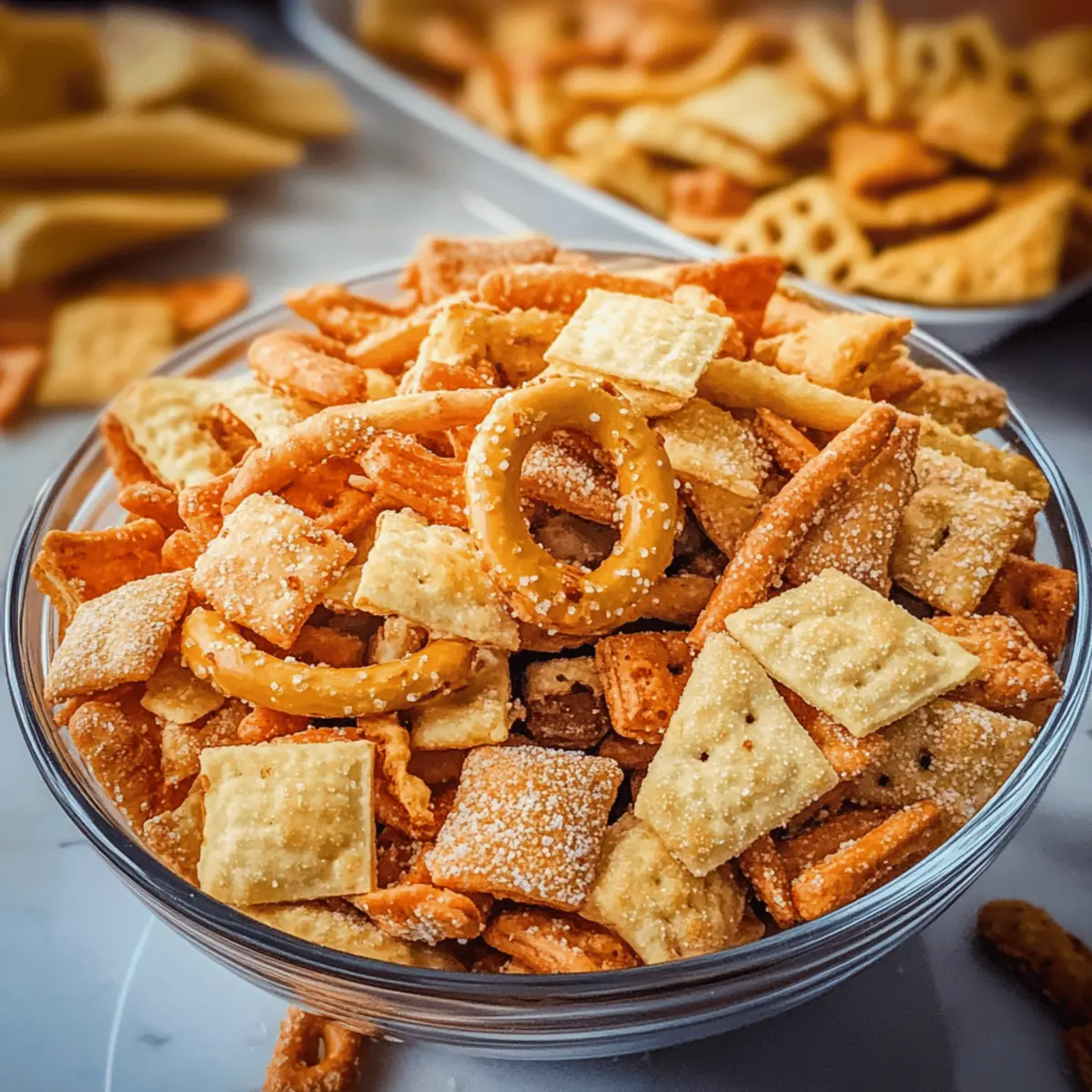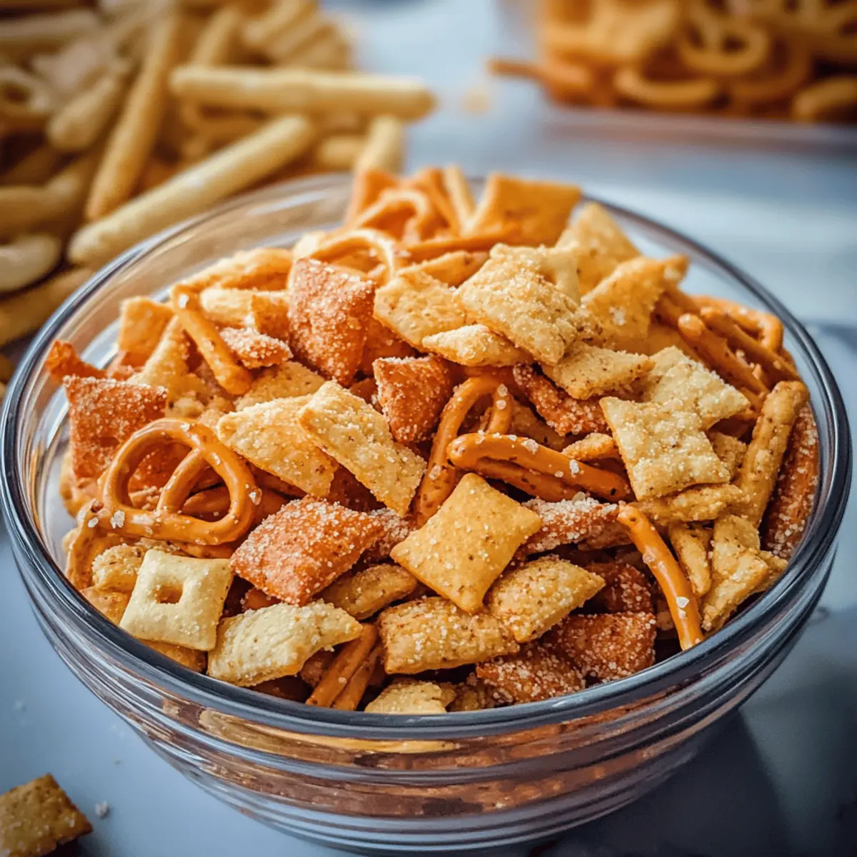 The door flies open, and a wave of irresistible scents fills the room—welcome to the world of my Million Dollar Snack Mix! This delightful combination features six crunchy snacks tossed together with zesty Parmesan, creating the perfect game day indulgence or cozy movie night munchie. What I love about this versatile recipe is not only its quick prep time but also how easily you can customize the spice level to suit your taste. Whether you’re a fan of mild or crave a bit of heat, this snack mix caters to all. With its savory crunch and a melty cheese finish, you might just find it disappearing faster than you can prepare it! Ready to elevate your snacking experience? Let me share how to create this delicious blend that’s sure to impress family and friends. Why is this snack mix a must-try? Bold flavors: The Million Dollar Snack Mix is bursting with crunchy, cheesy goodness that appeals to everyone. Customizable spice: You control the heat! Adjust the crushed red pepper to match your preferences, making it fun for all taste buds. Quick preparation: Ready in just 15 minutes, this snack mix saves you time without skimping on taste, perfect for unexpected guests! Party perfection: Serve it at your next gathering, and watch it disappear in moments—it’s a total crowd-pleaser! For more savory snack ideas, check out our Million Dollar Chicken that pairs perfectly with this snack mix! Million Dollar Snack Mix Ingredients For the Snack Base • Cheez-Its – A crunchy base that gives the mix its delightful flavor. • Cheddar Cheese Flavored Chex Mix – Adds varied textures and cheesy goodness. • Bugles – Unique cone-shaped snacks that bring a fun crunch. • Cheddar Cheese Goldfish Crackers – Extra cheesy bites for maximum flavor. • Mini Saltine Crackers – Light and crispy to balance the stronger flavors. • Pretzel Twists – Salted crunch that enhances the overall texture. For the Flavoring • Freshly Grated Parmesan Cheese – Adds rich umami flavor; don’t be shy to sprinkle more! • Canola Oil (or Olive Oil) – Helps achieve that irresistible crispiness; olive oil adds a flavorful twist. • Crushed Red Pepper – Perfect for adjusting the heat; start with 1 tablespoon for a mild kick. • Garlic Powder – Provides savory depth and delicious aroma. • Kosher Salt – Enhances flavors; use to taste. • Black Pepper – Mild seasoning that complements the mix perfectly. Step‑by‑Step Instructions for Million Dollar Snack Mix Step 1: Preheat the Oven Begin by preheating your oven to 250°F (120°C). While the oven warms up, line a rimmed baking sheet with parchment paper to prevent sticking. This is a crucial step in achieving a perfectly crunchy texture for your Million Dollar Snack Mix as it helps the snacks toast evenly and enhances their flavor. Step 2: Combine the Snack Base In a large mixing bowl, combine the Cheez-Its, Cheddar Cheese Flavored Chex Mix, Bugles, Cheddar Cheese Goldfish Crackers, mini saltines, and pretzel twists. Use your hands or a spatula to gently mix the ingredients together until they are well-distributed. This ensures each bite of your Million Dollar Snack Mix contains a delightful variety of textures and flavors. Step 3: Add Seasonings and Oil Sprinkle the freshly grated Parmesan cheese over the snack mixture and then drizzle in the olive oil. Add the crushed red pepper, garlic powder, kosher salt, and black pepper. Toss everything together thoroughly to ensure that each crunchy piece gets coated with the delicious seasoning blend. You want that cheesy goodness and zesty kick to meld beautifully! Step 4: Spread on Baking Sheet Carefully spread the seasoned snack mixture evenly on the prepared baking sheet. If you’re feeling extra cheesy, sprinkle some additional Parmesan on top. This layering action not only enhances the flavor of your Million Dollar Snack Mix but also creates a beautiful surface for even baking. Step 5: Bake to Perfection Place the baking sheet in the oven and bake the snack mix for approximately 15 minutes. Stir halfway through the baking process to ensure an even toast. You’ll know it’s ready when the mix is lightly golden and has a pleasant crunch, inviting everyone to indulge in its savory aroma. Step 6: Cool and Store Once baking is complete, remove the baking sheet from the oven and let the mix cool for a few minutes. As the Million Dollar Snack Mix cools, it will crisp up even more. Once fully cooled, transfer the mix to an airtight container for storing; it will stay fresh and delicious for a week, though it might not last that long! Expert Tips for Million Dollar Snack Mix • Spice Control: Adjust the crushed red pepper carefully. 1 tablespoon gives a gentle heat, perfect for newbies. Test a small amount before going bold! • Oil Choice: While both canola and olive oil are great, olive oil enhances flavor but might not crisp as well. Use it sparingly for the best results. • Avoid Soggy Snack: Ensure your mix is well-coated but not drenched in oil. This helps achieve that irresistible crunchy texture for your Million Dollar Snack Mix. • Mix it Up: Feel free to get creative! Swap out a snack for your favorite—maybe some pretzel sticks or even cheese puffs for a twist! • Even Toasting: Stir the mix halfway through baking. This is key to achieving even toastiness and maximizing flavor in every bite. Make Ahead Options These Million Dollar Snack Mix preparations are perfect for busy home cooks looking to save time! You can easily assemble the mix of Cheez-Its, Cheddar Cheese Flavored Chex Mix, Bugles, Goldfish crackers, mini saltines, and pretzel twists up to 24 hours in advance. Just combine all the dry ingredients and store them in an airtight container at room temperature until you’re ready to bake. To maintain the mix’s quality, keep it away from moisture. When you’re ready to enjoy, simply sprinkle on the Parmesan cheese, oil, and seasonings, toss well, and bake for about 15 minutes unt