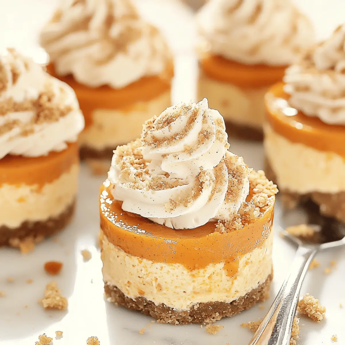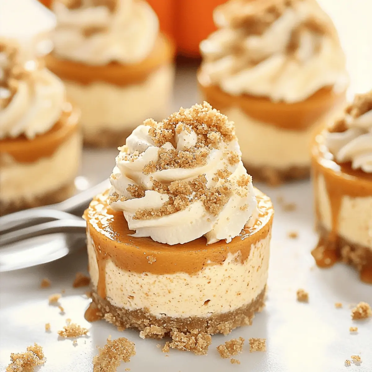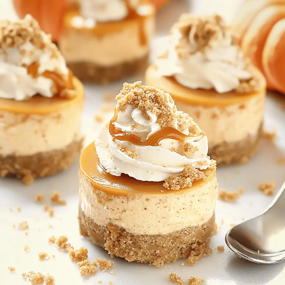 As the leaves begin to turn and that crisp autumn air settles in, it’s time to embrace the cozy flavors of the season. I’ve whipped up a batch of No Bake Pumpkin Mini Cheesecakes that capture the essence of fall like no other dessert can. These little delights are not only incredibly simple to prepare—perfect for those busy days leading up to Thanksgiving and Halloween—but they also promise a creamy, dreamy experience that will leave your guests swooning. Imagine indulging in individual servings of light, fluffy pumpkin cheesecake resting on a buttery graham cracker crust, all without ever turning on the oven. Who could resist? Let’s dive into this effortless recipe that will elevate your autumn gatherings. What toppings will you choose to make them your own? Why Are These Cheesecakes a Must-Try? Irresistible Flavor: Each mini cheesecake bursts with warm pumpkin spice and creamy richness, perfectly capturing fall in every bite. No-Bake Convenience: Say goodbye to complicated baking! These easy-to-make treats can be whipped up in no time, making them ideal for those busy holiday preparations. Individual Portions: Serving them in mini cups means everyone can enjoy their own delightful dessert without needing to share. Versatile Toppings: Dress them up with whipped cream, caramel, or even chocolate, allowing you to customize each serving to suit your mood or occasion. If you love easy and delicious desserts, check out my No Bake Strawberry Cheesecake for a sweet twist! Crowd-Pleasing Appeal: Perfect for Thanksgiving or Halloween gatherings, these mini cheesecakes will wow your guests and are sure to become a seasonal favorite. No Bake Pumpkin Mini Cheesecakes Ingredients For the Crust Graham Crackers – 1 cup, crushed; provides a crispy base. Substitute with gluten-free graham crackers for a gluten-free option. Granulated Sugar – 2 tbsp; adds sweetness to the crust. Can be replaced with coconut sugar for a more natural alternative. Ground Cinnamon – 1/4 tsp; enhances flavor with warm spice notes. Optional to increase for more spice. Unsalted Butter – 5 tbsp, melted; binds the crust together. Use coconut oil for a dairy-free version. For the Filling Heavy Whipping Cream – 1/2 cup, cold; adds lightness and creaminess to the filling. Substitute with whipped coconut cream for a dairy-free option. Cream Cheese – 8 ounces, room temperature; the main component for the filling, giving richness. Vegan cream cheese is a possible substitution. Powdered Sugar – 1/2 cup; sweetens the cheesecake. Can be swapped with maple syrup or agave syrup for a different sweetness profile. Pumpkin Puree – 3/4 cup; provides pumpkin flavor and moisture. Fresh or canned pumpkin can be used. Vanilla Extract – 1 tsp; adds depth of flavor. Use fresh vanilla if available for enhanced flavor. Pumpkin Pie Spice – 2 1/2 tsp; essential for autumn flavoring; can mix your own with cinnamon, nutmeg, and ginger. Step‑by‑Step Instructions for No Bake Pumpkin Mini Cheesecakes Step 1: Prepare Your Cups Start by gathering 8 individual baking cups, such as mini springform pans or paper cups. Place them on a sturdy baking tray for easy handling later. This step ensures each delicious No Bake Pumpkin Mini Cheesecake is perfectly portioned for indulging! Step 2: Make the Crust In a medium mixing bowl, combine 1 cup of crushed graham crackers, 2 tablespoons of granulated sugar, and 1/4 teaspoon of ground cinnamon. Pour in 5 tablespoons of melted unsalted butter, mixing until everything is evenly coated. Press this mixture firmly and evenly into the bottoms of your prepared cups using a shot glass, then chill in the refrigerator while you prepare the filling. Step 3: Whip the Cream In a separate large bowl, pour in 1/2 cup of cold heavy whipping cream. Using an electric mixer, whip the cream on high speed until stiff peaks form, which should take about 3-4 minutes. This whipped cream will add a delightful lightness to your No Bake Pumpkin Mini Cheesecakes, so keep an eye on it to avoid overmixing! Step 4: Prepare the Filling In another large mixing bowl, beat 8 ounces of room temperature cream cheese along with 1/2 cup of powdered sugar on medium-high speed until the mixture is smooth and silky, which should take approximately 2-3 minutes. This creamy base will provide rich flavor and texture for your cheesecake filling, so be thorough! Step 5: Add Pumpkin and Spices With the cream cheese mixture ready, gently fold in 3/4 cup of pumpkin puree, 1 teaspoon of vanilla extract, and 2 1/2 teaspoons of pumpkin pie spice. Mix until the pumpkin and spices are fully integrated, creating a beautifully rich orange filling that is the star of your No Bake Pumpkin Mini Cheesecakes. Step 6: Combine Cream and Filling Carefully fold in the whipped cream from Step 3 into the pumpkin filling mixture, ensuring you’re gentle to maintain the airy texture. This process should take about 1-2 minutes. You’ll know it’s ready when no streaks remain, and you achieve a lovely, fluffy consistency for your cheesecake filling. Step 7: Assemble the Cheesecakes Now, scoop the pumpkin cheesecake filling generously onto the prepared crust in each cup. Use a spatula to smooth the tops ensuring an even and tidy finish. Once filled, gently tap the tray on the counter to release any air bubbles, then cover with plastic wrap and refrigerate for at least 3-4 hours to allow the cheesecakes to set properly. Step 8: Serve and Garnish After chilling, your No Bake Pumpkin Mini Cheesecakes will be ready to impress! Before serving, add optional garnishes like whipped cream, salted caramel, or crushed graham crackers to enhance that autumn charm. Enjoy these delightful mini desserts with family and friends at your holiday gatherings! Expert Tips for No Bake Pumpkin Mini Cheesecakes Room Temperature Cheese: Ensure your cream cheese is at room temperature for easier blending, helping to achieve a smooth, creamy filling without lumps. Gentle Folding: Be 