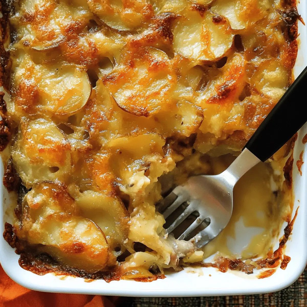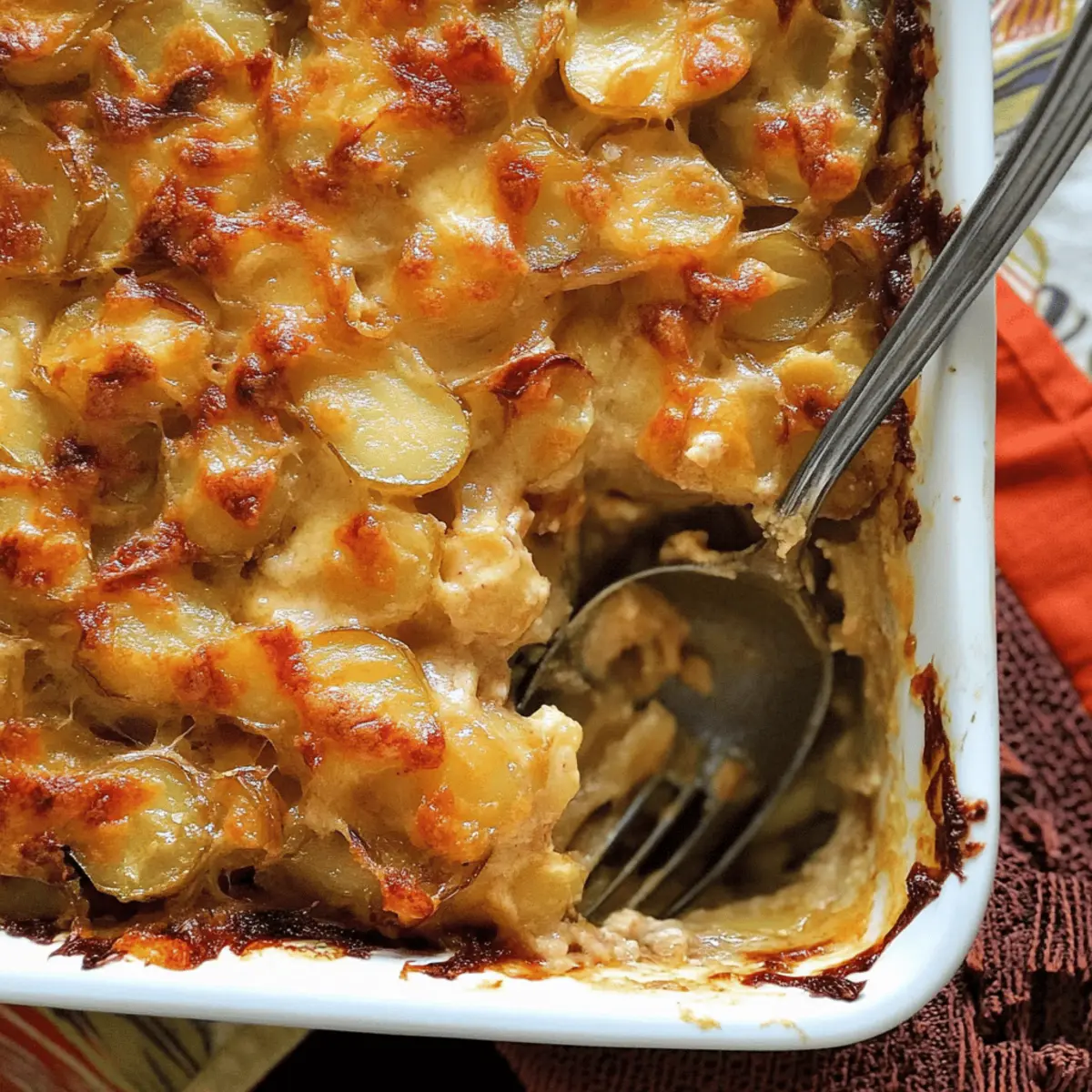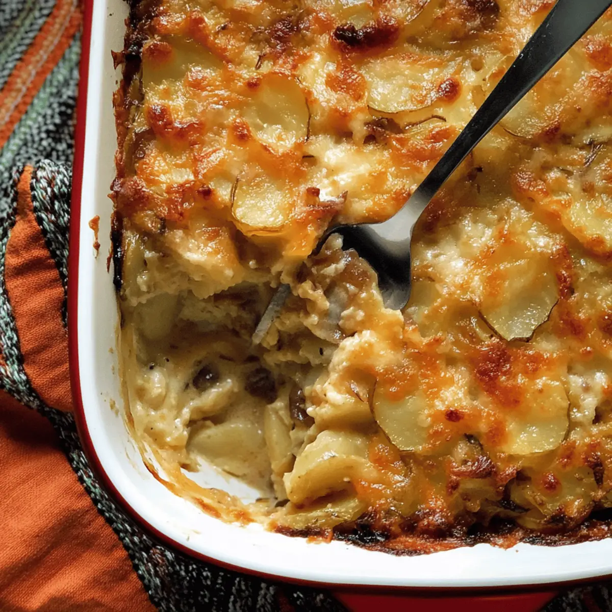As I stood in my kitchen, the aroma of caramelizing onions and leeks swiftly enveloped me, instantly evoking the warmth of home-cooked meals shared with loved ones. There’s something undeniably comforting about a Potato, Caramelized Onion & Leek Gratin that turns an ordinary day into a celebration. This vegetarian dish not only brings a delightful twist to your Thanksgiving table but also serves as perfect comfort food for cozy evenings. Picture thinly sliced russet potatoes layered lovingly with succulent onions and leeks, blanketed in a creamy white wine sauce and topped with gooey Manchego cheese. It’s surprisingly easy to whip up and a guaranteed crowd-pleaser that everyone will adore. Ready to transform your meal into a heartwarming experience? Let’s dive into this deliciously cheesy adventure together! Why is This Gratin a Must-Try? Comforting Layers: Each bite of this Potato, Caramelized Onion & Leek Gratin delivers a warm hug of flavor, perfect for comforting evenings. Easy to Prepare: With simple steps, even novice cooks can shine at the dinner table. You’ll impress guests without spending hours in the kitchen! Versatile Dish: Whether it’s a holiday feast or a cozy weeknight dinner, this gratin fits right in. Pair it with a fresh salad or your favorite roasted veggies for a wholesome meal. Exceptional Flavor: The blend of caramelized onions, leeks, and creamy white wine sauce makes it irresistibly savory and unique. Cheesy Delight: Topped with Manchego cheese, it creates a gooey, golden crust that’s surely a crowd favorite. And if you’re curious, check out our French Onion Chicken for another cheesy option! Potato, Caramelized Onion & Leek Gratin Ingredients For the Gratin Unsalted Butter – Adds richness and helps sauté vegetables; substitute with olive oil for a dairy-free option. Large Onions (2) – Provides a sweet, caramelized flavor; can substitute with shallots for a milder taste. Leek (1) – Offers a mild onion flavor and depth; ensure to use only the white and light green parts. Salt (2 tsp, divided) – Enhances flavor; adjust to taste. Brown Sugar (1 tbsp) – Balances the savory elements by adding sweetness during caramelization. Vegetable Broth (1 cup, divided) – Adds moisture and flavor; chicken broth can be used for a non-vegetarian option. White Wine (⅔ cup) – Adds acidity and depth; can be replaced by more broth for a non-alcoholic version. Heavy or Light Cream (⅔ cup) – Provides creaminess; non-dairy cream can be used as a substitute. Balsamic Vinegar (1 tsp) – Adds a tangy flavor; rice vinegar can be an alternative. Russet Potatoes (3 lbs) – The base of the gratin; must be thinly sliced for even cooking. Minced Fresh Thyme (2 tsp, divided) – Adds an aromatic herbal note; dried thyme can substitute if fresh is unavailable. Black Pepper (1 tsp, divided) – Adds heat; adjust to preference. Shredded Manchego Cheese (1½ cups) – Provides a nutty, distinct flavor; Gruyère cheese is a good alternative. Enjoy these rich ingredients as you prepare the ultimate warm hug of a dish, the Potato, Caramelized Onion & Leek Gratin! Step‑by‑Step Instructions for Potato, Caramelized Onion & Leek Gratin Step 1: Preheat the Oven Start by preheating your oven to 350°F (175°C). This step ensures that when your Potato, Caramelized Onion & Leek Gratin is ready to bake, it cooks evenly and achieves that bubbling, golden perfection you desire. Step 2: Sauté the Onions and Leeks In a large skillet, melt unsalted butter over medium-high heat. Once melted, add thinly sliced large onions and leeks along with 1 teaspoon of salt. Sauté for about 5 minutes until they begin to soften and take on a light golden color, filling your kitchen with a sweet aroma. Step 3: Caramelize the Mixture Next, stir in 1 tablespoon of brown sugar with the onions and leeks in the skillet. Continue cooking while stirring for another 5 minutes until the mixture turns a rich golden brown. The sugar will caramelize, enhancing the savory profile of the Potato, Caramelized Onion & Leek Gratin. Step 4: Add Broth and Simmer Pour in ½ cup of vegetable broth and allow the mixture to cook for an additional 5 minutes. Stir occasionally as the mixture thickens and becomes sticky, then transfer this delicious caramelized blend to a bowl and set it aside, letting those flavors meld. Step 5: Prepare the Creamy Sauce In the same skillet, combine the remaining ½ cup of vegetable broth, ⅔ cup of white wine, and ⅔ cup of heavy cream along with 1 teaspoon of salt. Bring this mixture to a gentle boil, allowing the flavors to meld beautifully. Once boiling, stir in 1 teaspoon of balsamic vinegar, then remove the skillet from heat. Step 6: Layer the Potatoes In a greased baking dish, start layering half of the thinly sliced russet potatoes. Sprinkle with minced fresh thyme and black pepper to season. Then, add the bowl of caramelized onions and leeks, creating a flavorful layer before topping with the remaining sliced potatoes, thyme, and additional black pepper for a delightful kick. Step 7: Pour the Creamy Mixture Carefully pour the creamy sauce mixture over the layered potatoes, ensuring it seeps down through the layers for optimal flavor distribution. At this stage, your Potato, Caramelized Onion & Leek Gratin should be dripping with deliciousness, ready to go into the oven. Step 8: Bake the Gratin Cover the baking dish with aluminum foil and place it in the preheated oven for 30 minutes. This will allow the gratin to bubble up beautifully. After 30 minutes, carefully remove the foil to let the top brown and bake for an additional 30-40 minutes until the cheese has melted and is bubbling. Step 9: Let It Rest Before Serving Once your gratin is golden brown and irresistibly cheesy, remove it from the oven. Allow it to cool for about 15 minutes before serving. This resting time not only enhances the flavors but also helps the layers set perfectly for that first, satisfying scoop of Po
