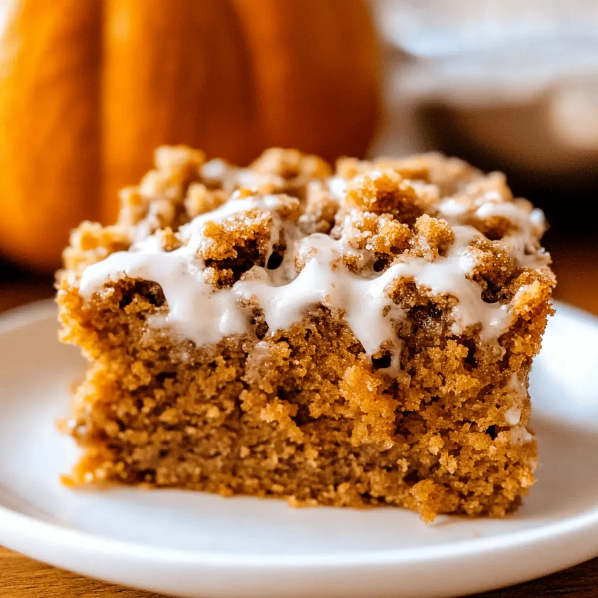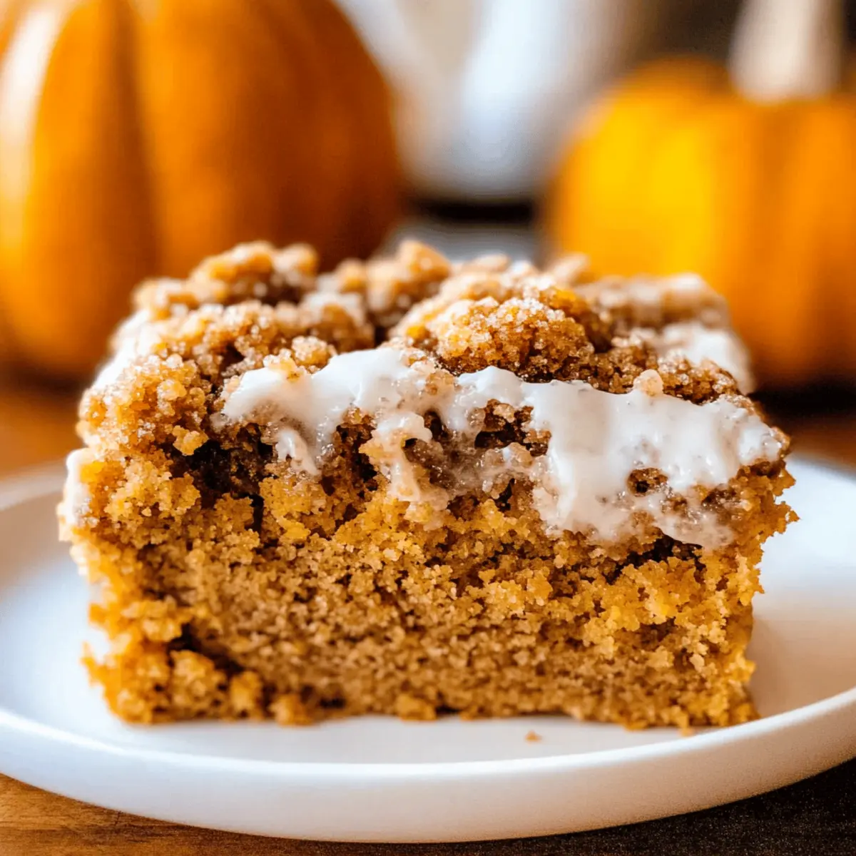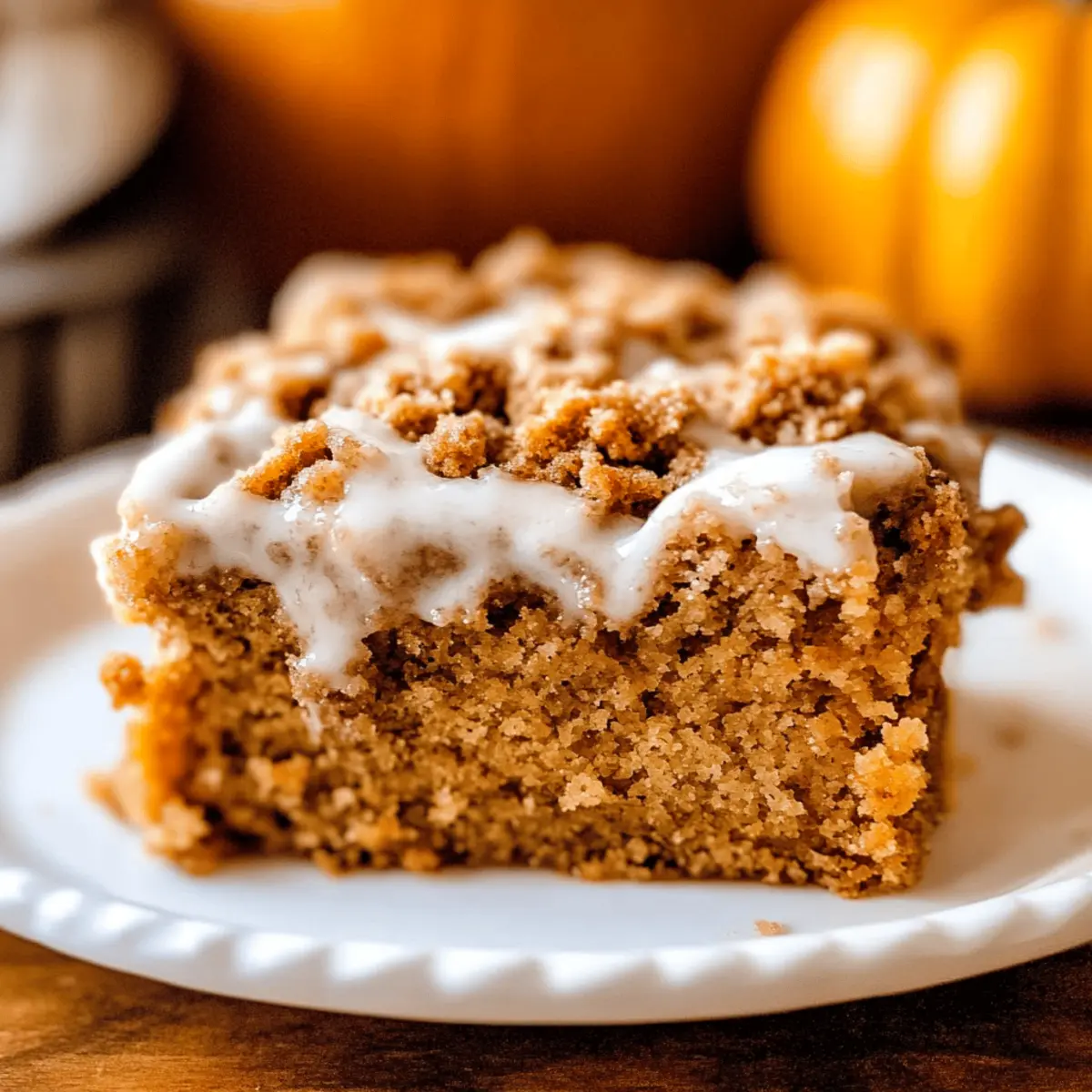 As I sat sipping my morning coffee, the scent of warm spices wafted through my kitchen, instantly whisking me away to my favorite autumn memories. This Pumpkin Streusel Coffee Cake is what dreams are made of—a delightful twist on a classic coffee cake, infused with the richness of pumpkin and a crumbly streusel top. Not only does it make for a cozy, light dessert, but it also serves as a scrumptious brunch option that will impress your guests. With minimal prep time and the promise of a soft, moist texture, it’s the perfect way to embrace the season. Ready to take your baking to the next level? Let’s dive into this delicious fall treat together! Why is this Pumpkin Coffee Cake special? Irresistible Flavor: The blend of pumpkin and warm spices creates an inviting aroma and taste that’s perfect for cozy gatherings. Effortless Preparation: With simple steps and minimal ingredients, this recipe invites even novice bakers to whip up a delightful treat. Crowd-Pleasing Delight: Serve it warm with a cup of coffee or tea, and watch as friends and family gather around for seconds! Versatile Treat: Whether you enjoy it as a dessert or a brunch option, this Pumpkin Streusel Coffee Cake fits perfectly into any occasion or meal. For another autumn-inspired delight, try my Espresso Chocolate Cheesecake—it’s a true crowd favorite! Pumpkin Coffee Cake Ingredients For the Cake • All-purpose flour – 4 1/4 cups total is essential for providing structure to the Pumpkin Coffee Cake, ensuring it rises beautifully. • Brown sugar – 1 cup adds a lovely sweetness and moisture; you can use granulated sugar if you prefer a lighter color. • Granulated sugar – 2 cups total helps balance sweetness and can be swapped with coconut sugar for a healthier option. • Kosher salt – 2 3/4 teaspoons enhances the flavors; feel free to use sea salt if that’s what you have on hand. • Cinnamon – 2 tablespoons bring warmth and spice to the mix; substitute with pumpkin pie spice for a more complex flavor. • Pumpkin pie spice – 2 tablespoons is the secret to that quintessential fall essence; can be omitted if not available. • Butter – 2 cups total (1 cup melted, 1/2 stick softened) lends richness; opt for unsalted butter for better control over salt levels. • Canned pumpkin puree – 15 oz provides that signature pumpkin flavor and moisture; ensure it’s not pumpkin pie filling. • Large eggs – 4 bind everything together perfectly; for a vegan option, substitutes like flax or applesauce may work. • Vegetable oil – 1/4 cup adds tenderness; light-flavor olive oil can serve as an excellent alternative. • Vanilla extract – 1 tablespoon + 1 teaspoon adds depth; pure vanilla is preferred over imitation for the best flavor. For the Streusel Topping • All-purpose flour – 1 cup is the base for your streusel, creating a delightful crunch. • Brown sugar – 1/2 cup here enhances sweetness and richness; granulated sugar can be used if you prefer. • Granulated sugar – 1/4 cup for an extra touch of sweetness in the topping. • Butter – 1/2 cup, melted, gives the streusel its crumbly texture and buttery flavor. • Cinnamon – 1 teaspoon intensifies the streusel with warm notes; optional, but highly recommended! For the Glaze • Powdered sugar – 2 cups sweetens and finishes the cake; consider a low-sugar alternative for a lighter version. • Milk – 3 tablespoons smooths out the glaze consistency; any non-dairy milk can also be swapped in. Embrace the warmth of fall with this Pumpkin Coffee Cake that’s perfect for any gathering! Step‑by‑Step Instructions for Pumpkin Coffee Cake Step 1: Preheat and Prepare Start by preheating your oven to 350°F (175°C) while you grease a 9×13 inch cake pan with butter or cooking spray to prevent sticking. This step is crucial as it ensures your Pumpkin Coffee Cake rises beautifully and bakes evenly. Keep the pan nearby for easy access as you progress through the recipe. Step 2: Make the Streusel Topping In a medium bowl, whisk together 1 cup of all-purpose flour, 1/2 cup brown sugar, 1/4 cup granulated sugar, 1 teaspoon of cinnamon, and a pinch of salt until well combined. Pour in 1/2 cup of melted butter and mix until the mixture resembles wet sand. Set this aside; it will add a delicious crumbly texture to your Pumpkin Coffee Cake. Step 3: Combine Dry Ingredients Grab a large mixing bowl and whisk together 4 1/4 cups of all-purpose flour, 2 cups of granulated sugar, 2 3/4 teaspoons of kosher salt, 2 tablespoons of cinnamon, and 2 tablespoons of pumpkin pie spice until well-blended. This blend will infuse your cake with warm flavors, setting the foundation for your scrumptious Pumpkin Coffee Cake. Step 4: Incorporate Wet Ingredients Mix 1 cup of softened butter into the dry ingredients until crumbly. Then, add 15 oz of canned pumpkin puree and stir until incorporated. In a separate bowl, whisk together 4 large eggs, 1/4 cup vegetable oil, and 1 tablespoon plus 1 teaspoon of vanilla extract. Add this mixture to the batter and combine until just blended for a moist and flavorful cake base. Step 5: Layer the Batter and Streusel Spoon 2 cups of the cake batter evenly into the prepared pan, smoothing it to create a solid base. Sprinkle 1 cup of the streusel topping over the batter, ensuring even coverage. Repeat this layering process, adding more batter followed by more streusel, and finishing with the remaining streusel on top for a delightful crunch in your Pumpkin Coffee Cake. Step 6: Bake to Perfection Slide the pan into your preheated oven and bake the cake for 35 minutes. After this initial baking time, quickly add the remaining streusel on top and return it to the oven for another 10-15 minutes. Check for doneness by inserting a toothpick into the center; it should come out clean when your Pumpkin Coffee Cake is ready. Step 7: Cool and Glaze Once baked, remove your Pumpkin Coffee Cake from the oven and let it cool in the pan for at 