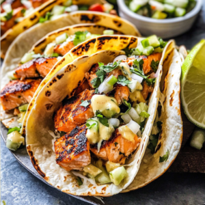 Introduction to Seared Chipotle Salmon Tacos There’s something magical about a taco night, isn’t there? The sizzle of the skillet, the vibrant colors of fresh ingredients, and the anticipation of that first bite. My Seared Chipotle Salmon Tacos are not just a meal; they’re a celebration of flavor and simplicity. Perfect for a busy weeknight or a casual gathering with friends, these tacos come together in just 20 minutes. They’re packed with spicy goodness and topped with fresh veggies, making them a delightful choice for anyone looking to impress without spending hours in the kitchen. Let’s dive into this culinary adventure! Why You’ll Love This Seared Chipotle Salmon Tacos These Seared Chipotle Salmon Tacos are a game-changer for your dinner routine. They’re quick to whip up, taking only 20 minutes from start to finish. The combination of smoky chipotle and fresh toppings creates a flavor explosion that will have your taste buds dancing. Plus, they’re healthy and gluten-free, making them a guilt-free indulgence. Trust me, once you try these, taco night will never be the same! Ingredients for Seared Chipotle Salmon Tacos Gathering the right ingredients is the first step to taco perfection. Here’s what you’ll need for these Seared Chipotle Salmon Tacos: Salmon fillets: Fresh salmon is the star of this dish, providing a rich, buttery flavor. Look for wild-caught if possible for the best taste. Olive oil: This helps achieve that perfect sear on the salmon. Extra virgin olive oil adds a nice depth of flavor. Chipotle chili powder: This spice brings the heat and smokiness that makes these tacos unforgettable. You can adjust the amount based on your spice tolerance. Garlic powder: A staple in many kitchens, it adds a savory punch without the hassle of fresh garlic. Cumin: This warm spice enhances the overall flavor profile, giving it a hint of earthiness. Smoked paprika: It adds a subtle smokiness that complements the chipotle perfectly. Salt and pepper: Essential for seasoning, they elevate the flavors of all the ingredients. Corn tortillas: These are the perfect vessel for your salmon. They’re gluten-free and add a lovely texture. Shredded red cabbage: This adds crunch and a pop of color, making your tacos visually appealing. Avocado: Creamy avocado slices balance the spice and add richness. Fresh cilantro: A sprinkle of cilantro brightens up the dish with its fresh, herbal notes. Lime: Lime wedges are a must for squeezing over the tacos, adding a zesty finish. For those looking to spice things up even more, consider adding sliced jalapeños or a drizzle of your favorite hot sauce. You can find the exact quantities for each ingredient at the bottom of the article, ready for printing! How to Make Seared Chipotle Salmon Tacos Creating these Seared Chipotle Salmon Tacos is a breeze! Follow these simple steps, and you’ll have a delicious meal ready in no time. Let’s get cooking! Step 1: Prepare the Spice Mixture In a small bowl, combine the chipotle chili powder, garlic powder, cumin, smoked paprika, salt, and pepper. Mix them well until they’re evenly blended. This spice mixture is the heart of your tacos, bringing that smoky, spicy flavor that will make your taste buds sing! Step 2: Season the Salmon Take your salmon fillets and rub the spice mixture evenly over both sides. Make sure to coat them well, so every bite is packed with flavor. This step is crucial for achieving that delicious, spicy kick that defines these tacos! Step 3: Sear the Salmon Heat the olive oil in a large skillet over medium-high heat. Once the oil is shimmering, carefully place the salmon fillets skin-side down in the skillet. Sear for about 4-5 minutes until the skin is crispy. Flip the fillets and cook for another 3-4 minutes until they’re cooked through. The aroma will be irresistible! Step 4: Warm the Tortillas In a dry skillet over medium heat, warm the corn tortillas for about 30 seconds on each side. This step makes them pliable and enhances their flavor. You want them soft and ready to cradle all that delicious salmon! Step 5: Assemble the Tacos Once the salmon has rested for a few minutes, flake it into bite-sized pieces. Distribute the salmon evenly among the warm tortillas. Top each taco with shredded red cabbage, creamy avocado slices, and a sprinkle of fresh cilantro. Don’t forget to squeeze lime juice over the top for that zesty finish! Tips for Success Use a fish spatula for flipping the salmon; it’s gentle and won’t break the fillets. Let the salmon rest for a few minutes after cooking to keep it juicy. Warm the tortillas just before serving to maintain their softness. Experiment with toppings like diced tomatoes or a drizzle of crema for extra flavor. Prep your ingredients ahead of time to streamline the cooking process. Equipment Needed Skillet: A non-stick or cast-iron skillet works best for searing the salmon. Fish spatula: Ideal for flipping the salmon without breaking it; a regular spatula will do in a pinch. Small bowl: For mixing the spice blend; any mixing bowl will suffice. Tongs: Handy for handling the warm tortillas. Variations Grilled Chipotle Salmon: Instead of searing, grill the salmon for a smoky flavor. Just preheat your grill and cook the fillets until flaky. Vegetarian Option: Swap the salmon for grilled portobello mushrooms or marinated tofu for a delicious plant-based alternative. Spicy Kick: Add sliced jalapeños or a drizzle of your favorite hot sauce for an extra layer of heat. Different Toppings: Try adding mango salsa or pickled red onions for a fresh twist on the traditional toppings. Low-Carb Version: Use lettuce wraps instead of corn tortillas for a lighter, low-carb option. Serving Suggestions Pair your tacos with a refreshing corn salad for a colorful side dish. Serve with black beans for added protein and fiber. A chilled cerveza or a zesty margarita complements the flavors beautifully. Garnish with extra lime wedges and cilantro for a v