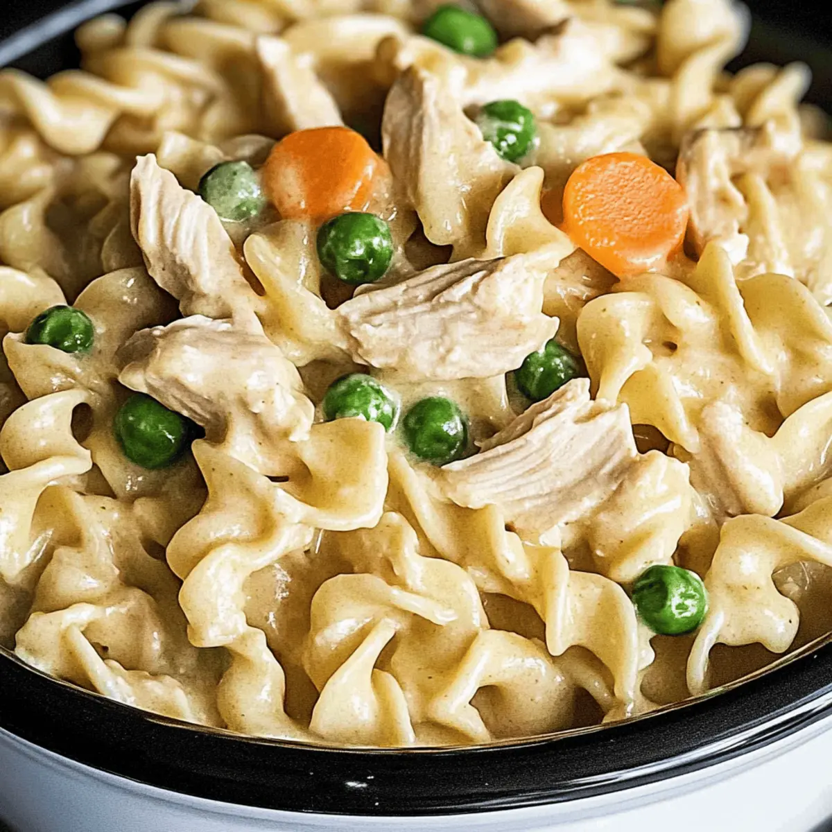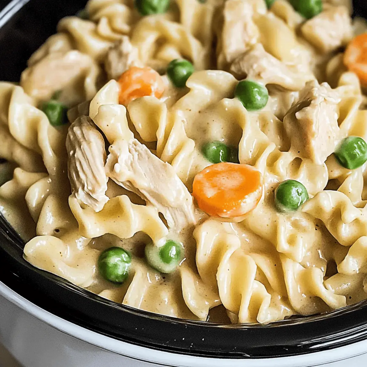 The slow hiss of the slow cooker fills my kitchen with a cozy, inviting aroma that instantly transports me back to family dinners of my childhood. Today, I’m thrilled to share my Creamy Slow Cooker Chicken Noodle Casserole, a delightful twist where classic chicken pot pie flavors collide with tender egg noodles. This recipe is not only a one-pot wonder that’s perfect for busy weeknights, but it’s also a crowd-pleaser that brings everyone together around the dinner table. With minimal prep time and the rich, creamy texture that comforts like a warm hug, you’ll find yourself reaching for seconds, and maybe even thirds. Are you ready to embrace a hearty meal that feels like home? Let’s dive in! Why Is This Recipe So Special? Simplicity makes weeknight cooking stress-free, requiring only a few easy steps. Hearty and Comforting, this dish combines the beloved flavors of chicken pot pie with creamy pasta for a warm embrace on your plate. Time-saving thanks to the slow cooker, you can focus on other tasks while it works its magic. Customizable to suit your family’s tastes, toss in veggies or adjust the noodles as needed. Plus, it’s a crowd-pleaser—perfect for family gatherings or cozy dinners! If you loved my recipe for Cheesy Chicken Enchiladas, I’m sure this creamy casserole will quickly become a favorite too. Slow Cooker Chicken Pot Pie Pasta Ingredients For the Casserole • Chicken Breast – Cooked and chopped; this is your protein powerhouse, bringing heartiness to the dish. • Frozen Peas and Carrots – Adds vibrant color and nutrients; feel free to swap for fresh vegetables if you prefer a crisper bite. • Frozen Corn – Infuses a touch of sweetness and crunch; fresh corn is a fantastic substitution when it’s in season. • Onion – Finely chopped for a savory depth; shallots can give a milder flavor twist. • Garlic – Minced to elevate the aromatic profile; garlic powder works in a pinch if you’re short on fresh. • Chicken Broth – The savory base of your casserole; vegetable broth can lighten things up if desired. • Heavy Cream – Brings a luxurious richness; substitute with milk and low-fat cream cheese for a lighter option. • Cream Cheese – Softened for that creamy texture; Neufchâtel cheese is a lower-fat alternative. • Dried Thyme – Offers a herby essence; fresh thyme can be used—just triple the amount for freshness. • Dried Parsley – For a pop of color and freshness; omit if you don’t have it on hand. • Salt and Pepper – Essential seasonings; adjust to complement your taste perfectly. • Egg Noodles – Ensure they’re cooked al dente before adding; you can swap with any pasta, just adjust cook times. • Grated Parmesan Cheese – Enhances the savory flavor; Pecorino Romano is a delightful alternative. • Fresh Parsley (optional) – Spruces up your dish with a touch of green when serving. Every component of this Slow Cooker Chicken Pot Pie Pasta recipe comes together to create a comforting, creamy experience that feels like a warm hug. Happy cooking! Step‑by‑Step Instructions for Slow Cooker Chicken Pot Pie Pasta Step 1: Prepare the Ingredients Begin by gathering your ingredients for the Slow Cooker Chicken Pot Pie Pasta. Chop your cooked chicken into bite-sized pieces and finely dice the onion and garlic. Measure out your frozen peas, carrots, and corn, ensuring they’re ready to go. This step will streamline your cooking process, making the assembly seamless! Step 2: Combine the Base In your slow cooker, add the chopped chicken along with the frozen peas, carrots, corn, diced onion, and minced garlic. These ingredients create a colorful and nutritious base. Ensure they are well mixed, laying the foundation for the comforting flavors to come. Step 3: Add the Broth and Cream Pour in the chicken broth and heavy cream, stirring to combine evenly with the chicken and vegetables. The liquid will create a creamy sauce that envelops each ingredient with flavor. This mixture should look luscious and inviting, hinting at the delicious meal ahead. Step 4: Integrate the Cream Cheese and Seasoning Carefully add the cream cheese in small chunks, followed by dried thyme, parsley, salt, and pepper to your slow cooker. These aromatic additions will enhance the overall taste of your casserole. Mix everything gently, ensuring all the components are coated in the creamy goodness. Step 5: Set the Slow Cooker Cover your slow cooker with its lid and set it to cook on LOW for 4-6 hours. This slow cooking process allows the flavors to meld beautifully and results in tender chicken. Stir occasionally during cooking to prevent sticking and ensure even blending of the ingredients. Step 6: Cook the Noodles About 30 minutes before you’re ready to serve, bring a pot of water to a boil and cook your egg noodles according to the package instructions until al dente. This timing ensures the noodles won’t become mushy when mixed with the slow cooker mixture. Step 7: Combine Everything Once the noodles are ready, drain them and carefully stir them into the slow cooker along with the grated Parmesan cheese. The cheese will add a delightful richness and help bind everything together. Ensure everything is thoroughly combined and heated through. Step 8: Let It Rest After mixing, let the Slow Cooker Chicken Pot Pie Pasta rest with the lid on for 5-10 minutes before serving. This resting period allows the flavors to settle and the casserole to thicken slightly, making it even more comforting when you serve up generous portions! Expert Tips for Slow Cooker Chicken Pot Pie Pasta Prep Ahead: Minimize stress by chopping vegetables the night before and storing them in the fridge to enhance flavor in your casserole. Chicken Safety: Always ensure your chicken is fully thawed before cooking to maintain food safety and achieve the best texture in your slow cooker chicken pot pie pasta. Pasta Perfection: To avoid mushy noodles, add them to the slow cooker abo