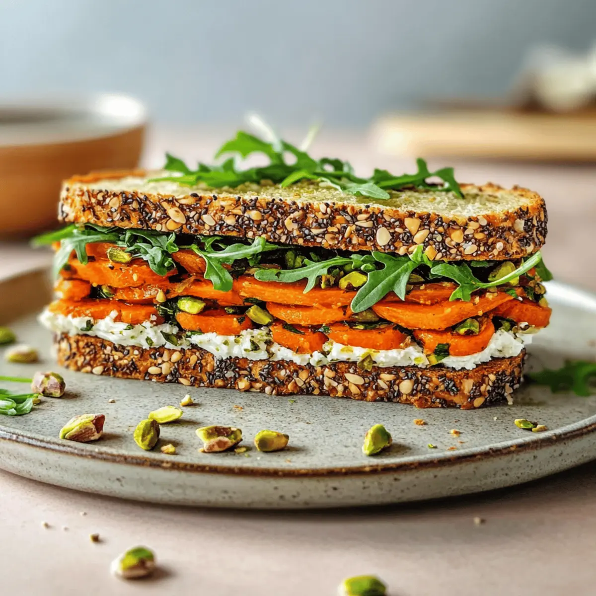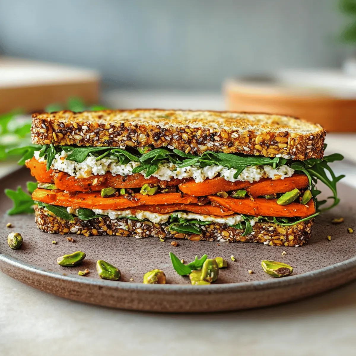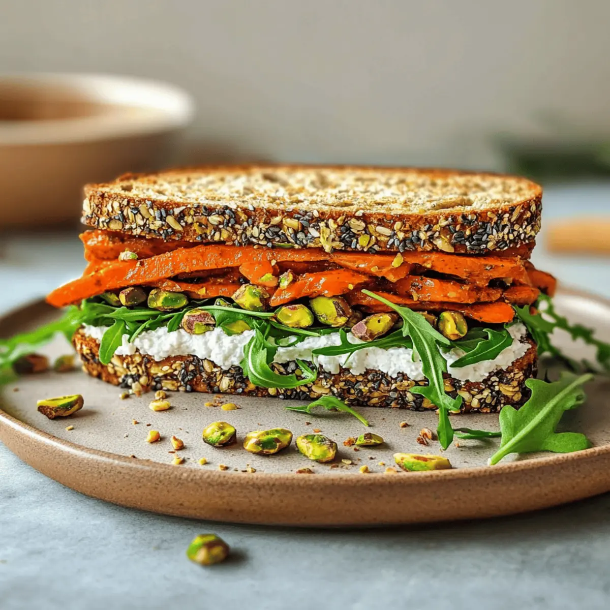 As I reached for the last bit of harissa in my spice cabinet, I couldn’t help but smile, knowing it would transform the mundane into something magnificent. That’s the magic behind this Spicy Harissa Carrot & Pistachio Sandwich—an exciting plant-based meal that’s bursting with personality. Tender, roasted carrots smothered in bold harissa meet crunchy pistachios and creamy almond cheese for a delightful explosion of flavor. Not only is this sandwich incredibly simple to throw together, but it also caters to your health goals with its wholesome ingredients—perfect for those hectic weekdays or leisurely picnics! Are you ready to elevate your lunch game and impress friends and family alike? Let’s dive into this delicious adventure together! Why is this sandwich a must-try? Bold flavors of spicy harissa and sweet carrots create a culinary delight that tantalizes your taste buds. Quick to make, it’s perfect for busy days or lazy weekends alike. Vegan and gluten-free, it accommodates diverse dietary needs without sacrificing flavor. Versatile enough to customize, you can adjust spices or toppings to suit your palate—try adding pickled onions for extra zing! Plus, it’s sure to impress guests, making it a standout dish for any gathering. Spicy Harissa Carrot & Pistachio Sandwich Ingredients For the Roasted Carrots Carrots – Naturally sweet and tender, they’re the star of the sandwich. Substitution: Use zucchini for a different taste. Harissa Paste – Adds that smoky, spicy kick—perfect for those bold flavors! Prep Note: Adjust the amount based on your spice tolerance. Olive Oil – Helps the carrots roast beautifully and caramelize. Substitution: Avocado oil provides a unique flavor profile. Salt and Pepper – Enhances all the other flavors. Tip: Freshly ground black pepper will elevate the taste. For the Sandwich Assembly Bread (multi-seed or whole grain) – The sturdy base for this delicious creation! Substitution: Try sourdough or ciabatta for a twist. Whipped Almond Cheese – Adds creamy richness to the sandwich. Substitution: Cashew cheese or vegan cream cheese can work beautifully too. Pistachios – A crunchy topping that brings a nutty flavor to each bite. Substitution: Walnuts or sunflower seeds also do the trick. Arugula – Provides a fresh, peppery note that brightens the sandwich. Substitution: Spinach or mixed greens can be used as alternatives. Lemon Zest/Juice – Brightens everything up and adds a refreshing touch. Tip: Fresh zest is preferred for maximum flavor. Each bite of the Spicy Harissa Carrot & Pistachio Sandwich promises a burst of excitement and flavor, making it a culinary adventure worth embarking on! Step‑by‑Step Instructions for Spicy Harissa Carrot & Pistachio Sandwich Step 1: Roast the Carrots Preheat your oven to 200°C (390°F) to prepare for roasting. In a large bowl, toss sliced carrots with harissa paste, olive oil, salt, and pepper until well-coated. Spread the carrots evenly on a baking tray and roast for 20-25 minutes. Turn them halfway through the cooking time until they are tender and slightly caramelized, releasing their sweet aroma. Step 2: Prepare the Bread While the carrots roast, you can prepare your bread for the Spicy Harissa Carrot & Pistachio Sandwich. If you prefer a crispy texture, toast the multi-seed or whole grain bread slices in a toaster or on a skillet over medium heat until golden brown. This will enhance the overall flavor and crunch, setting the stage for your hearty sandwich. Step 3: Spread the Almond Cheese Once the bread is toasted, take your whipped almond cheese and spread a generous layer on the bottom slice of each piece of toasted bread. This creamy layer acts as a barrier, preventing the bread from getting soggy and adding richness to each bite of the sandwich. Step 4: Assemble the Sandwich Now it’s time to build your Spicy Harissa Carrot & Pistachio Sandwich! Start by placing a handful of fresh arugula over the whipped almond cheese. Next, layer on your warm, roasted carrots, making sure they are evenly distributed for a perfect bite. Sprinkle a handful of crunchy pistachios over the top for added texture and nutty flavor. Step 5: Add Lemon Zest and Top To brighten the flavors of your sandwich, sprinkle fresh lemon zest over the roasted carrots and pistachios. This citrusy note will elevate the dish beautifully. Finally, place the second slice of toasted bread on top to complete your sandwich. Gently press down to help everything meld together before slicing it in half. Step 6: Serve and Enjoy Your Spicy Harissa Carrot & Pistachio Sandwich is now ready to be enjoyed! Slice the sandwich in half for easy handling, and serve it warm or at room temperature. This vibrant dish is perfect for lunch boxes, picnics, or casual gatherings, allowing everyone to savor the bold flavors packed between the slices. Spicy Harissa Carrot & Pistachio Sandwich Variations Feel free to get creative with this recipe and give it your unique twist! Dairy-Free: Substitute almond cheese with cashew cheese or store-bought vegan cream cheese for a creamy texture. Add a Kick: Include pickled red onions for an extra zesty crunch that enhances the overall flavor profile. Gluten-Free: Opt for gluten-free bread, so everyone can enjoy this delightful sandwich without worry. Nut-Free: Replace pistachios with sunflower seeds to keep the crunch while making it safe for those with nut allergies. Extra Veggies: Toss in some roasted bell peppers or zucchini to add depth and vibrant colors—who doesn’t love more veggies? Heat Lover’s Delight: For spice lovers, consider drizzling sriracha or adding jalapeños to your sandwich for that extra kick. Herb Infusion: Sprinkle fresh herbs like cilantro or dill for a refreshing twist that brightens up the whole dish. Dip and Delight: Serve with a side of homemade harissa dipping sauce made with vegan mayo for an indulgent experience. By exploring these variations, you can make the Spicy 
