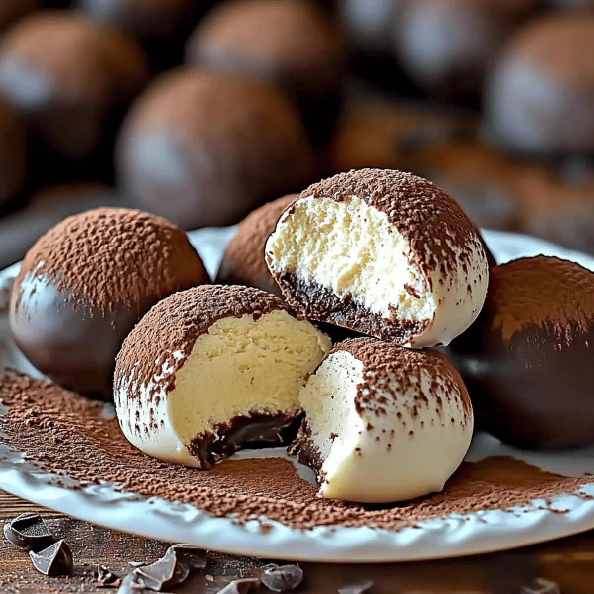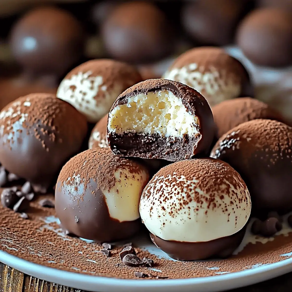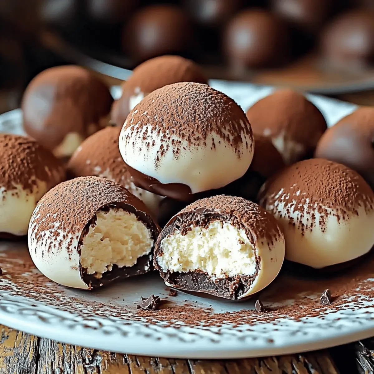 A burst of coffee-infused sweetness can turn an ordinary day into something special, don’t you think? That’s exactly what I felt when I crafted these Easy Tiramisu Chocolate Truffles, a delightful nod to the beloved Italian dessert we’ve all come to adore. Each truffle combines rich mascarpone and the bold essence of espresso, all beautifully wrapped in a chocolate shell. They’re not only a breeze to whip up, making them perfect for last-minute gatherings, but they also pack a punch of elegance, making them ideal for sharing or gifting. Whether it’s a cozy night in or a festive celebration, these little indulgences promise to elevate any occasion. Ready to dive into the sweet world of homemade tiramisu truffles? Let’s get started! Why are these Tiramisu Truffles irresistible? Simplicity: These Easy Tiramisu Chocolate Truffles come together in just a few steps, allowing you to enjoy a decadent dessert without fuss. Rich Flavor: The combination of mascarpone, espresso, and chocolate creates a luxurious taste that rivals your favorite café treats. Versatility: Whether you roll them in cocoa powder or dip them in chocolate, you can customize these truffles to suit any occasion. Pair them with other homemade delights or present them elegantly in a gift box for a truly special touch. Crowd Pleaser: They’re a guaranteed hit at parties, perfect for impressing guests or satisfying your sweet cravings. Elevate your gatherings with these elegant bites and introduce guests to a delightful Italian-inspired dessert! Make Ahead: With a little planning, you can prepare these truffles ahead of time, allowing the flavors to deepen overnight—if you can resist the temptation to eat them first! Tiramisu Truffles Ingredients • Get ready to create these delicious treats! For the Truffle Mixture • Ladyfingers – Provides base texture and flavor; use store-bought or homemade if preferred. • Mascarpone Cheese – Adds creaminess and richness; can substitute with cream cheese for a tangier flavor. • Powdered Sugar – Sweetens and provides smooth consistency; granulated sugar can be used but will alter the texture. • Espresso Powder – Infuses rich coffee flavor; instant coffee can work as an alternative, though flavor may vary. • Vanilla Extract – Enhances overall flavor profile; avoid imitation vanilla for better quality. For the Coating • Chocolate Chips – For coating; adds a rich, sweet exterior; dark chocolate chips or white chocolate can be used as an alternative. • Cocoa Powder – For dusting and added flavor; use Dutch-processed cocoa for a richer taste. Step‑by‑Step Instructions for Easy Tiramisu Chocolate Truffles Step 1: Prepare Mixture Begin by crushing the ladyfingers into fine crumbs using a food processor or by placing them in a sealed plastic bag and rolling with a rolling pin. In a medium bowl, combine the crushed ladyfingers, mascarpone cheese, powdered sugar, espresso powder, and vanilla extract. Mix everything together until the mixture is smooth and well combined, resembling a thick batter. This flavorful base will be the heart of your tiramisu truffles. Step 2: Form Truffles Once the mixture is ready, scoop out tablespoon-sized portions using a small ice cream scoop or your hands. Roll each portion into a smooth ball, ensuring they are uniform in size for even coating. Place the truffles on a parchment-lined baking sheet and refrigerate them for about 30 minutes. This chilling step helps the truffles firm up, making them easier to handle for the next steps. Step 3: Melt Chocolate While the truffles are chilling, prepare the coating by melting the chocolate chips. Place them in a microwave-safe bowl and microwave in 20-second intervals, stirring in between until the chocolate is completely smooth and glossy. Be careful not to overheat, as burned chocolate can ruin the flavor. This rich chocolate coating will give your tiramisu truffles a luxurious finish. Step 4: Coat Truffles Take the chilled truffles out of the refrigerator and dip each one into the melted chocolate, ensuring they are completely covered. You can use a fork or a toothpick to help with dipping. For a cocoa-dusted option, you can also roll the truffles in cocoa powder instead. Allow any excess chocolate to drip off before placing the truffles back onto the parchment-lined sheet. Step 5: Set Coating After coating all the truffles, place them back in the refrigerator for an additional 15 minutes to let the chocolate set. If you rolled them in cocoa powder, leave them out to dust with more cocoa for an elegant finish. Once the coating is firm, your easy tiramisu truffles are ready to be served, shared, or gifted to spread the joy of indulgence! What to Serve with Easy Tiramisu Chocolate Truffles Indulging in tiramisu chocolate truffles is a moment of joy, but what else can you pair with these delightful bites to create a full experience? Cappuccino: The creamy froth and rich coffee notes complement the espresso flavor of the truffles beautifully, making for a delightful pairing. This classic Italian beverage enhances the coffee experience while providing a warm, comforting touch. Chocolate Fondue: Dip fresh fruits or marshmallows into chocolate fondue alongside your truffles for a luxurious dessert spread. The variety of textures and flavors will keep your guests engaged and satisfied. Cheese Platter: A selection of creamy cheeses like mascarpone or ricotta can enhance the richness of the truffles, balancing sweetness with savory notes. Add some honey or fig jam to elevate the flavor profile even further. Savory Biscotti: The crunchy texture of biscotti adds a delightful contrast to the soft, creamy truffles, providing a satisfying crunch with each bite. Choose almond or chocolate-dipped varieties for a special touch. Moscato Wine: This sweet and slightly sparkling wine pairs beautifully with the luxurious flavors of the truffles, enhancing the overall indulgence of your dessert. The fru